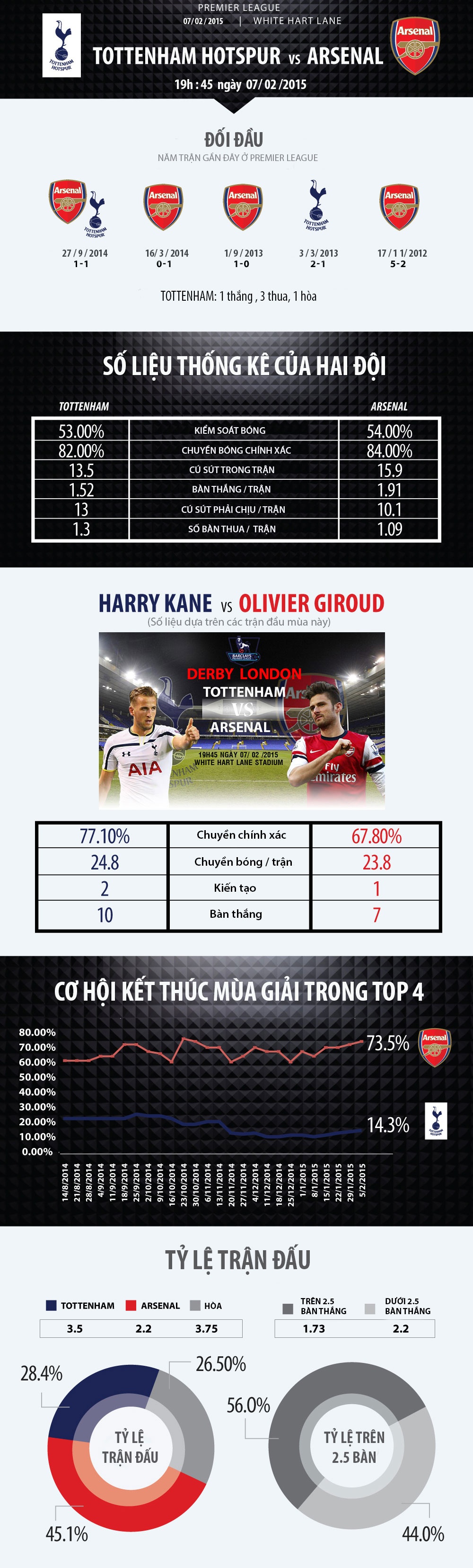 Hai CLB đang áp sát top 4 trước khi trận derby thành London ở White Hart Lane diễn ra lúc 19h45. Lợi thế sân nhà là điểm tựa cho Tottenham vượt lên trước Arsenal.