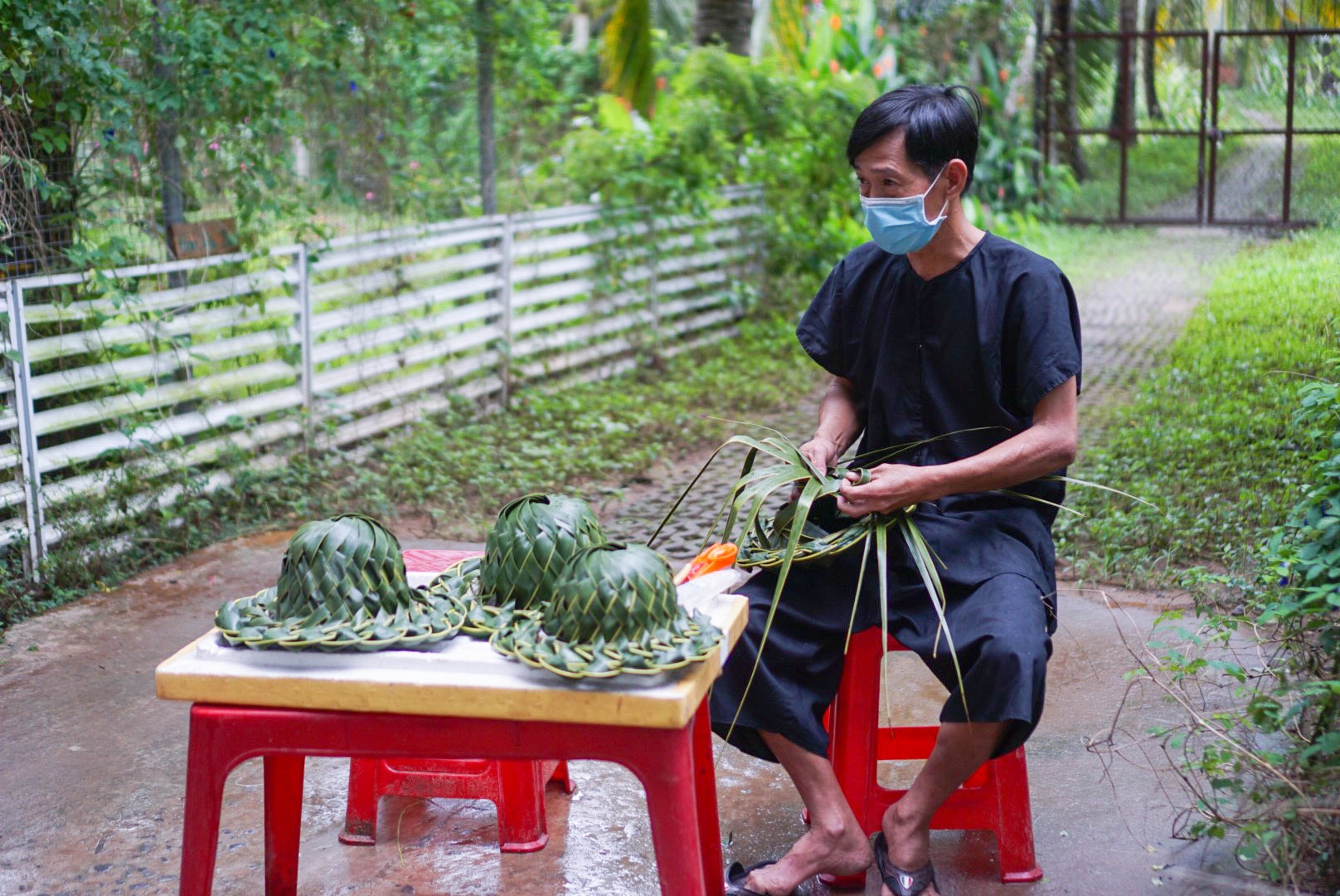 Nông trại du lịch Sân Chim - Vàm Hồ (huyện Ba Tri) đón chúng tôi với vườn cây ăn trái xum xuê bưởi da xanh, xoài và dừa. Tại đây, tôi được thỏa thích uống nước dừa và thử sức làm bánh lá, chụp một số bức ảnh sống ảo.