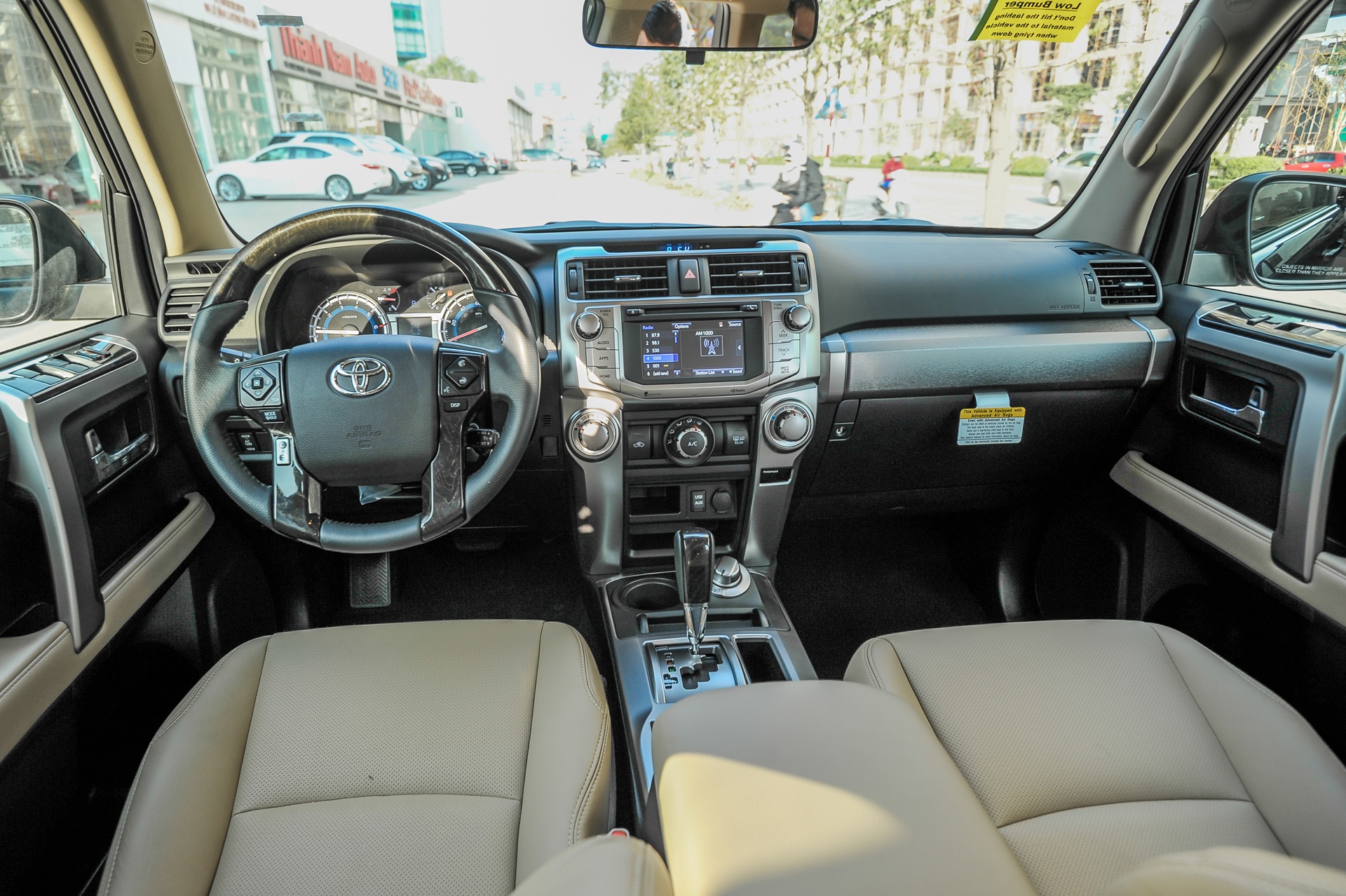 Vô lăng của 4Runner SR5 được bọc da và ốp giả gỗ, tích hợp nhiều phím bấm cho người lái. Mẫu SUV của Toyota hỗ trợ tính năng nhận diện điều khiển bằng giọng nói, cho phép người dùng truy cập danh bạ, giải trí, thoại rảnh tay.