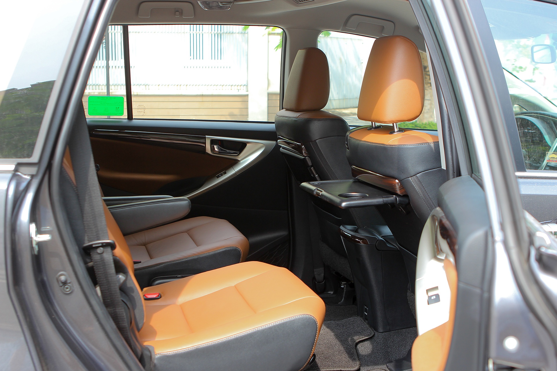 | Đúng với tính chất một “flagship” của dòng xe Innova 2016, phiên bản 2.0V tạo nên sự khác biệt rõ rệt với 2 phiên bản còn lại với ghế ngồi bọc da ở cả 3 hàng ghế. Ghế lái có thể chỉnh điện 8 hướng. Các chi tiết nhỏ khác như khay để cốc, cần số đều được thiết kế tinh tế. Toyota bố trí 2 khay để cốc ở 2 cửa gió điều hòa, giúp làm lạnh nước uống. |