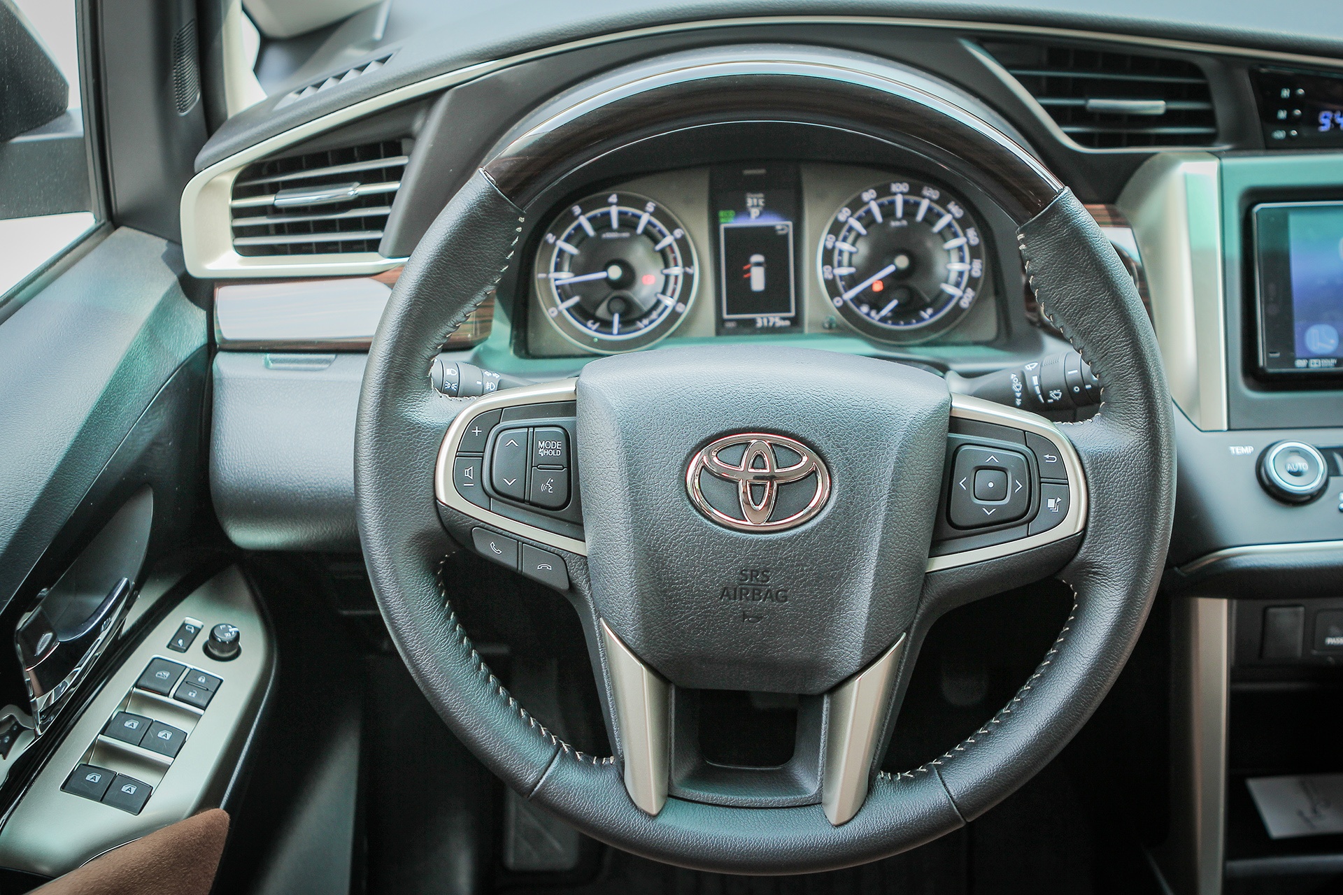| Vô lăng 4 chấu, ốp giả gỗ, bọc da và tích hợp nhiều nút bấm chức năng hoàn toàn khác biệt trên Innova 2.0V, gần như không thua kém gì những chiếc SUV trong cùng tầm tiền 1 tỷ đồng. Innova 2.0V không có tính năng kiểm soát hành trình.