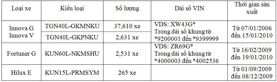 Cụ thể, tổng số xe bị ảnh hưởng của Chiến dịch triệu hồi này tại Việt Nam là 43.037 xe, bao gồm: 40.241 xe Innova và 2.531 xe Fortuner do TMV sản xuất và 265 xe Hilux do TMV nhập khẩu & phân phối. Chi tiết các xe bị ảnh hưởng như sau: