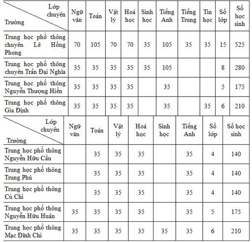 Điều kiện dự tuyển là học sinh đã tốt nghiệp trung học cơ sở tại TP HCM xếp hạnh kiểm, học lực cả năm học của các lớp 6, 7, 8 từ khá trở lên. Tốt nghiệp THCS loại giỏi. Riêng trường THPT chuyên Lê Hồng Phong, học sinh tốt nghiệp THCS ở các tỉnh khác được tham gia thi.