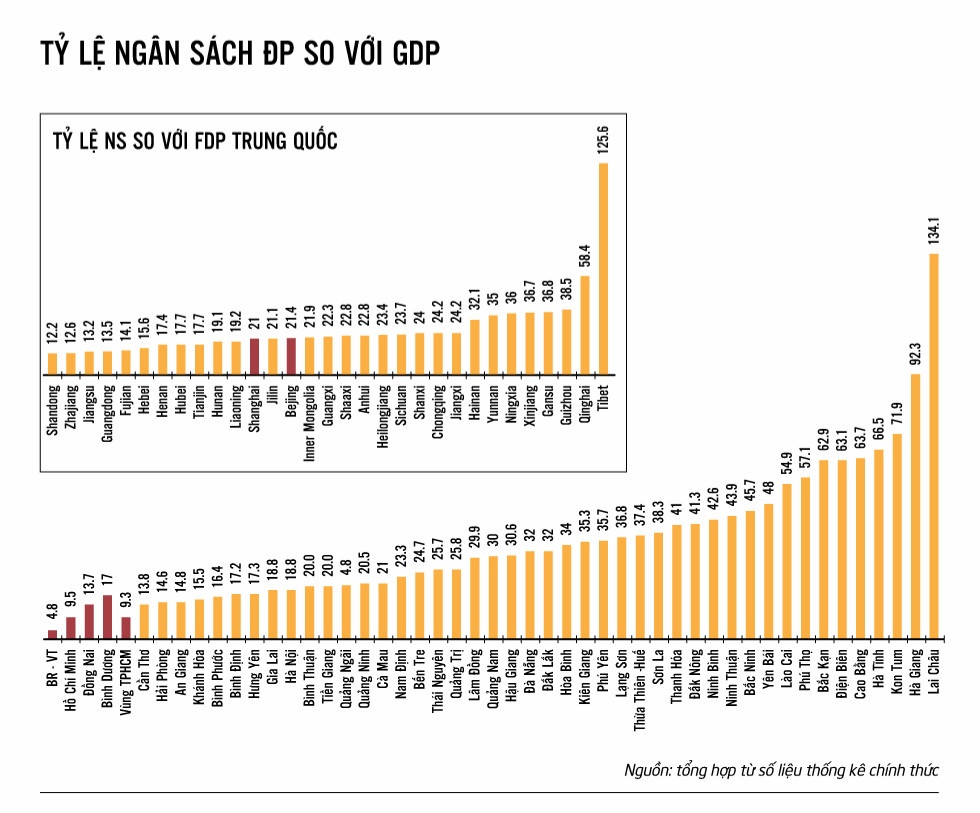 Nếu tính con số chi ngân sách lạc quan nhất là quyết toán năm 2012 của Bộ Tài Chính là gần 59.800 tỷ đồng (sau khi loại trừ chi chuyển nguồn) so 591.000 tỷ đồng GRDP thì tỷ lệ cũng chỉ khoảng 10%.