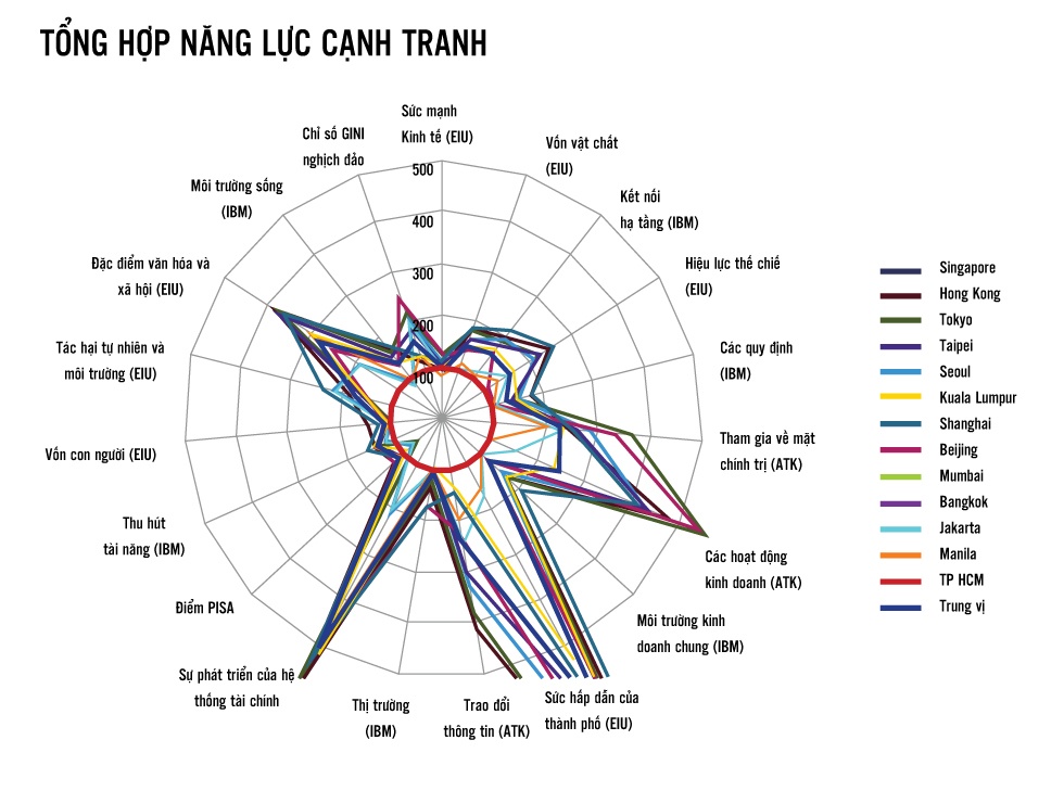 Tuy nhiên, nhìn ra bên ngoài và ở góc độ phát triển hướng tới một đô thị thịnh vượng được thể hiện qua hai tiêu chí là cạnh tranh (competitiveness) và đáng sống (livability), cho dù về vị trí địa lý, quy mô dân số và diện tích cũng như lịch sử hình thành không có nhiều khác biệt, nhưng TP HCM có vị trí rất thấp. Thấp nhất so với 12 thành phố trong khu vực – nhóm có thể xem là đối thủ cạnh tranh hay mục tiêu hướng đến của TP HCM.