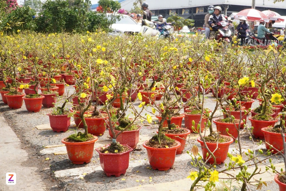 Theo ghi nhận của Tri Thức - Znews, sáng 27 tháng Chạp, các sạp bán mai mini ở đầu chợ hoa xuân Bình Điền thu hút lượng lớn khách ghé mua bởi mức giá siêu rẻ và chất lượng cây được đánh giá tốt, dao động 100.000-150.000 đồng/cặp.