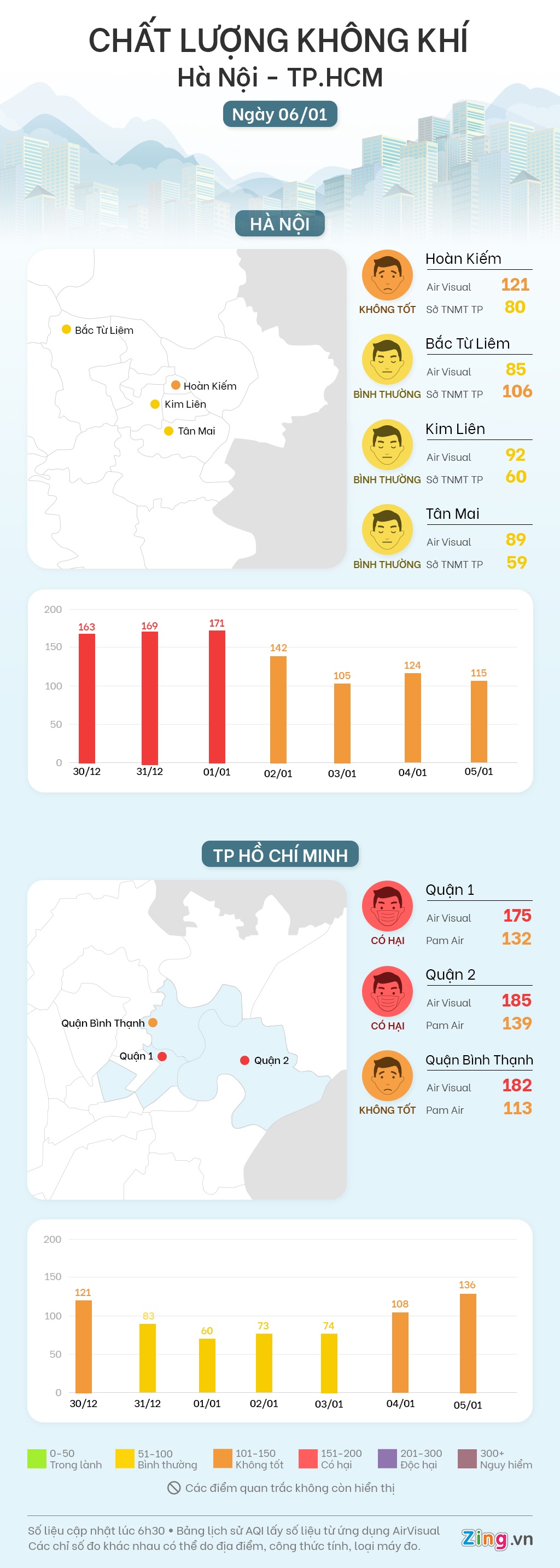 Sáng 6/1, các điểm quan trắc tại TP.HCM thể hiện chất lượng không khí ở ngưỡng kém. Còn chỉ số AQI Hà Nội ở ngưỡng trung bình, không khí trong lành hơn.