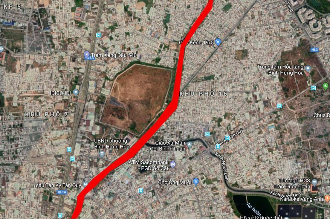 | Dự án cải tạo kênh Tham Lương - Bến Cát - rạch Nước Lên (đường màu đỏ) đoạn chảy qua quận Bình Tân (TP.HCM). Ảnh: Google Maps. |