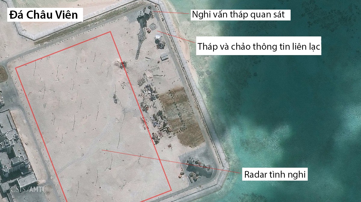 Ảnh vệ tinh cho thấy các hoạt động xây dựng của Trung Quốc trên đá Châu Viên ngày 24/1/2016. Những tòa tháp trên đá Châu Viên có thể là loại radar tấn số cao mà Trung Quốc sử dụng để giám sát mặt biển và không phận khu vực phía nam Biển Đông. Một trong số các công trình cao 20 m. Hiện tại, Trung Quốc đã gần hoàn thiện quá trình bồi lấp phi pháp trên đá Châu Viên với diện tích cải tạo lên tới 210.500 m2. |