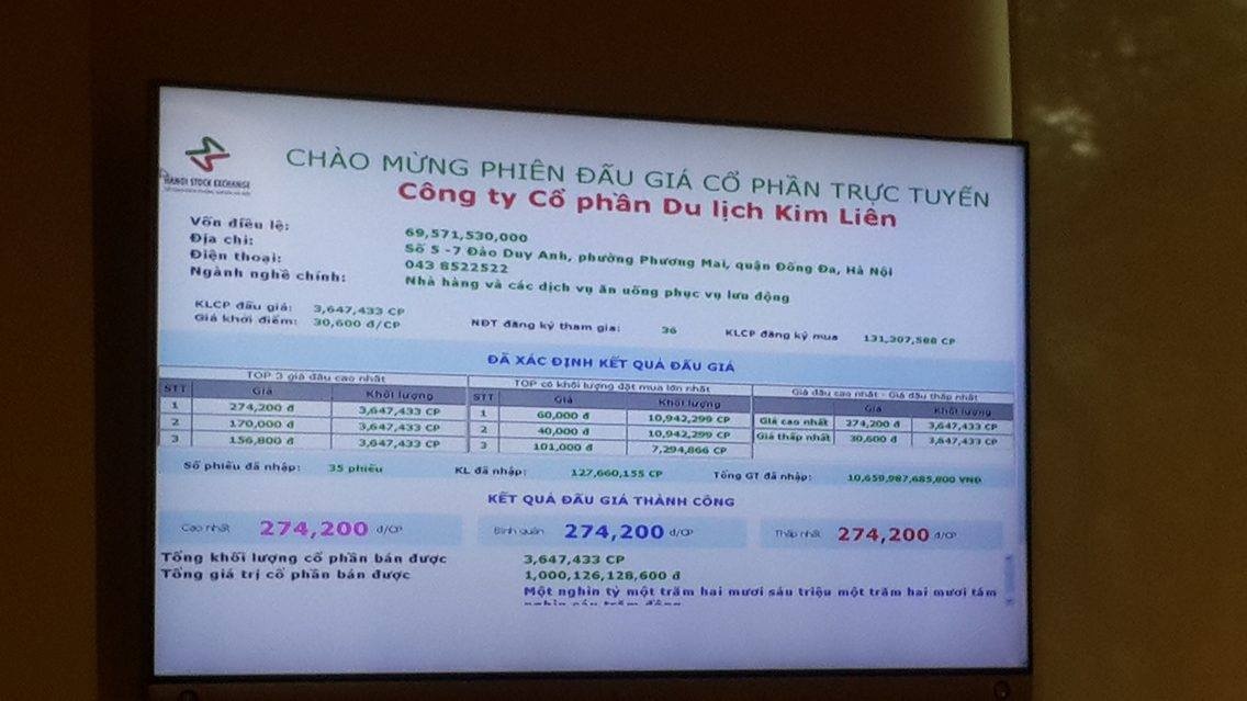 Phiên đấu giá cổ phần Công ty CP Du lịch Kim Liên tại Sở Giao dịch Chứng khoán Hà Nội vừa kết thúc. Người thắng cuộc đã bỏ ra 274.200 đồng/cổ phiếu để mua toàn bộ 3,647 triệu cổ phần. Giá trị quy đổi tương đương với hơn 1.000 tỷ đồng.