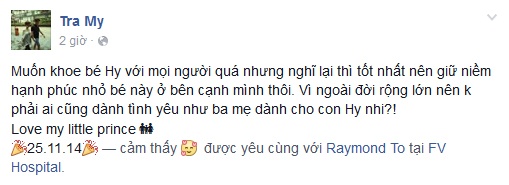Cô viết: "Muốn khoe bé Hy với mọi người quá nhưng nghĩ lại thì tốt nhất nên giữ niềm hạnh phúc nhỏ bé này ở bên cạnh mình thôi. Vì ngoài đời rộng lớn nên không phải ai cũng dành tình yêu như ba mẹ dành cho con Hy nhỉ".