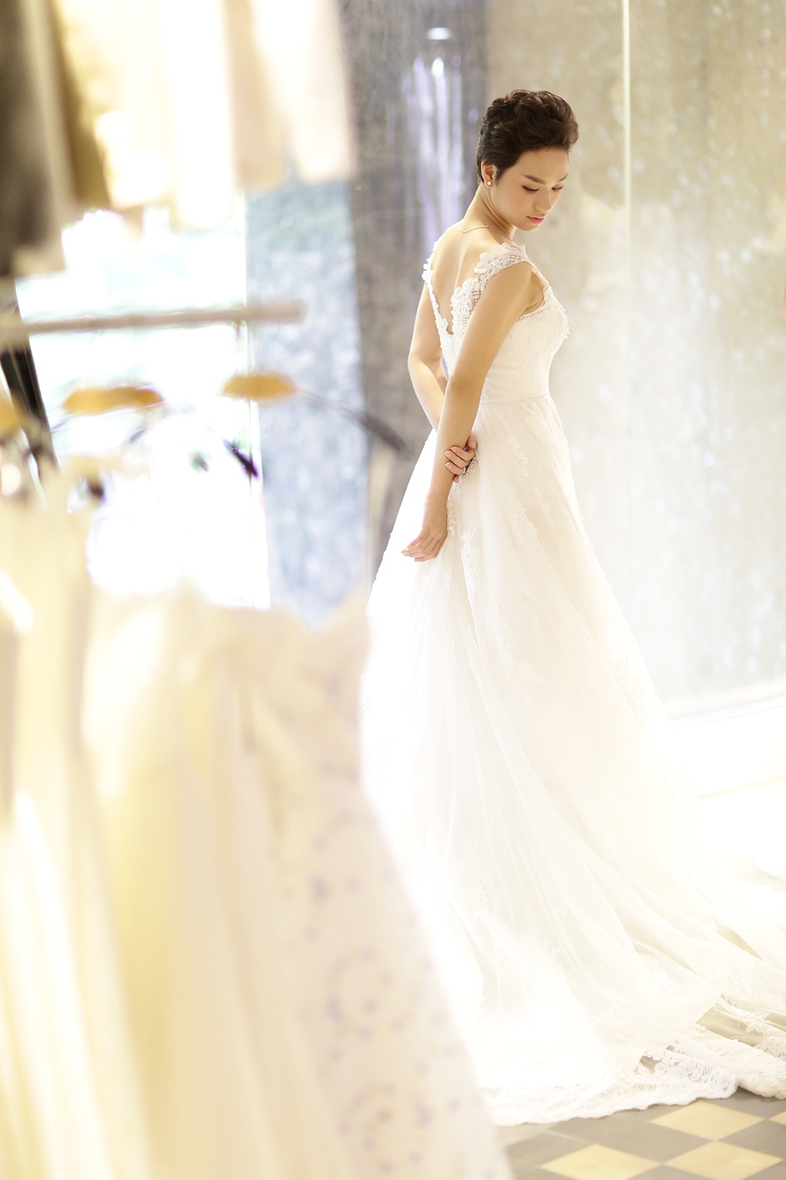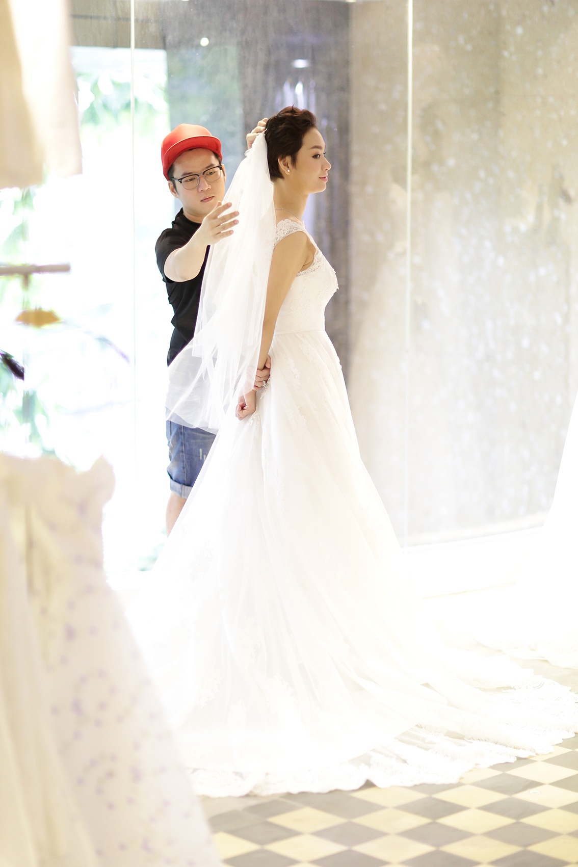 Trà My khá hào hứng trong buổi thử trang phục. Tông màu trắng cũng là màu mà cô và chồng yêu thích.