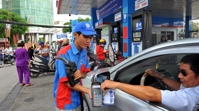 | Khách hàng trả tiền đổ xăng qua thẻ visa tại cửa hàng xăng dầu số 57, quận Tân Bình, TP.HCM. |