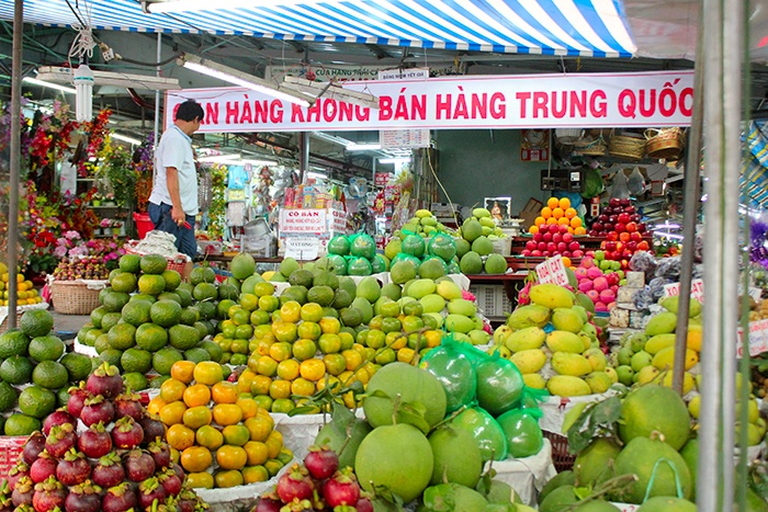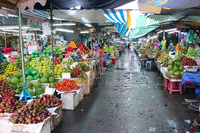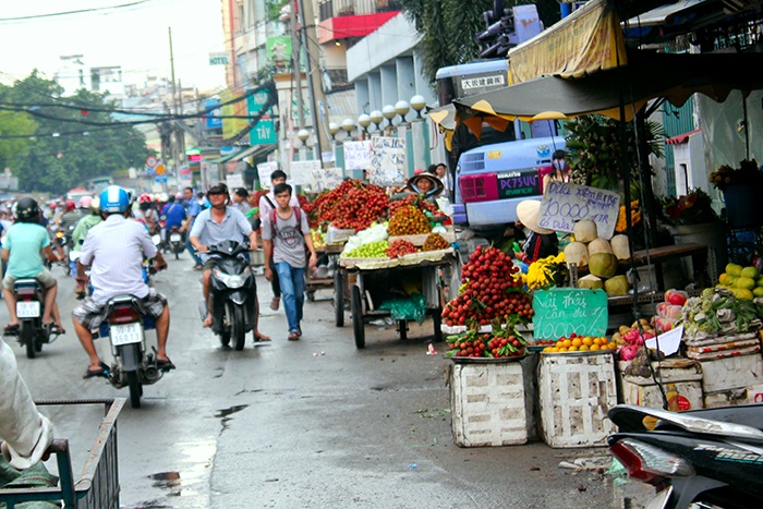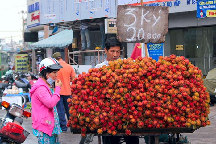 | Tại chợ Bà Chiểu, quận Bình Thạnh, trái cây rất phong phú với nhiều chủng loại tươi ngon, nhưng hầu hết các gian hàng cùng chung cảnh vắng khách. Bà Hoa, chủ một sạp trái cây tại chợ này cho biết: "Ra đầu ngõ là đủ các loại trái cây, giá lại rẻ bèo. Nhiều nhất là vải, chôm chôm, măng cụt.... đường nào cũng có nên khách ít vào chợ mua. Vào thời điểm này, tuy nhiều loại trái cây ngon, giá rẻ nhưng tôi không dám nhập hàng nhiều, sợ bán không hết". |
