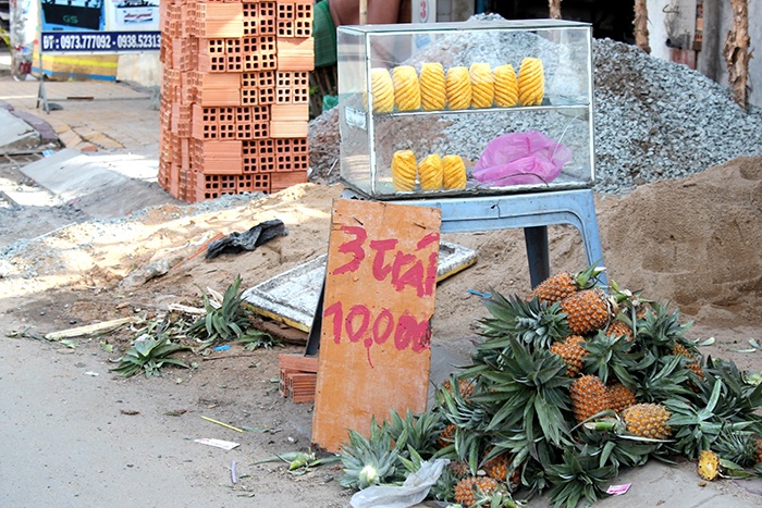 | Thơm được bày bán khắp các con đường, giá chỉ 10.000 đồng/3 trái. |