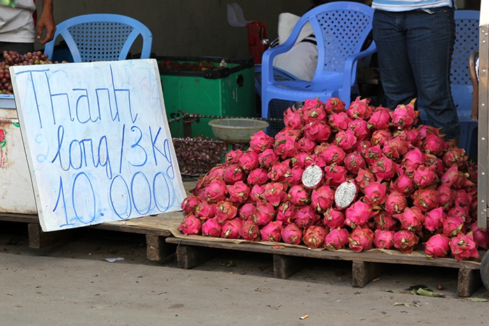 | Thanh long không xuất khẩu được cũng đổ dồn về các chợ, với giá 10.000 đồng/3kg. |