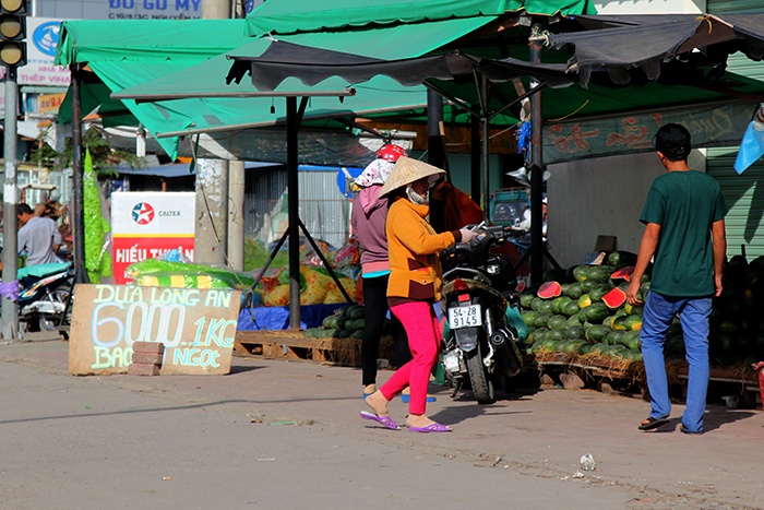 | Trên đường Nguyễn Văn Linh, quận 7, dưa hấu Long An, loại luôn có giá bán cao hơn so với các loại khác, cũng chỉ 6.000 đồng/kg, giảm hơn một nửa giá tháng trước. |