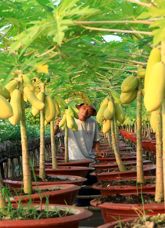 | Đu đủ kiểng cho trái vàng ở Sa Đéc là loại quả độc đáo được săn mua mạnh ở chợ Tết. |