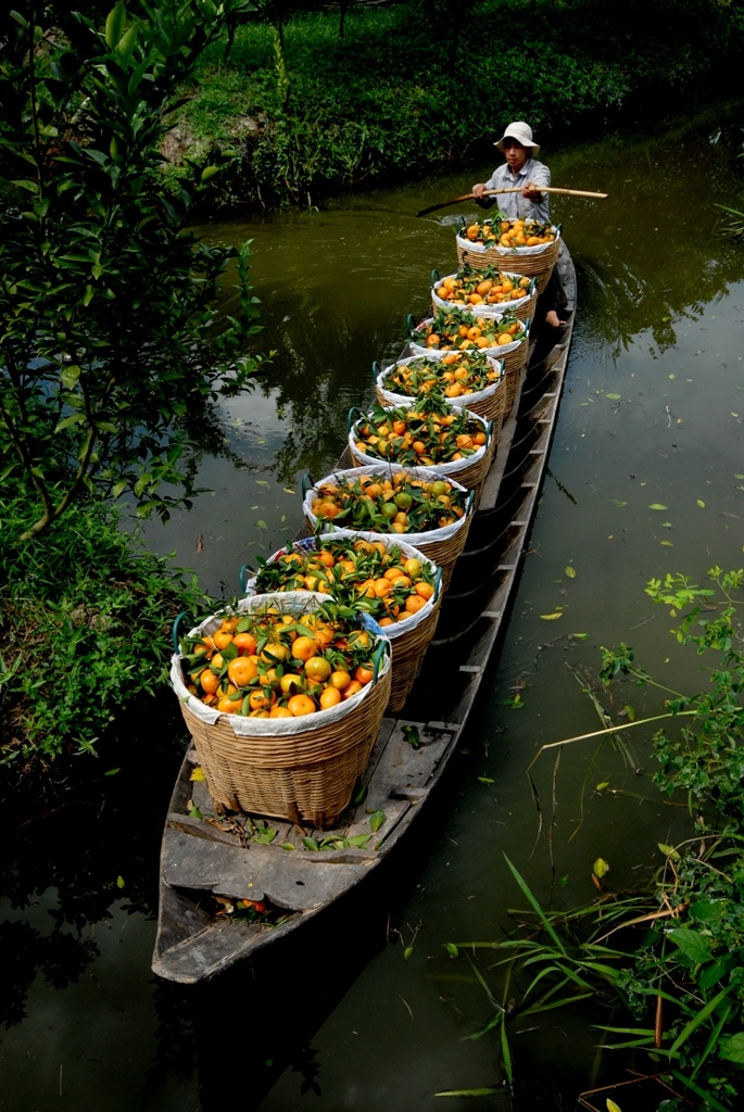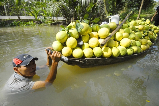 | Bưởi được chuyển từ trong vườn ra bờ kênh bằng xuồng. Nhà vườn bán bưởi sớm kỳ vọng giá tốt hơn so với giá bán cận tết. |