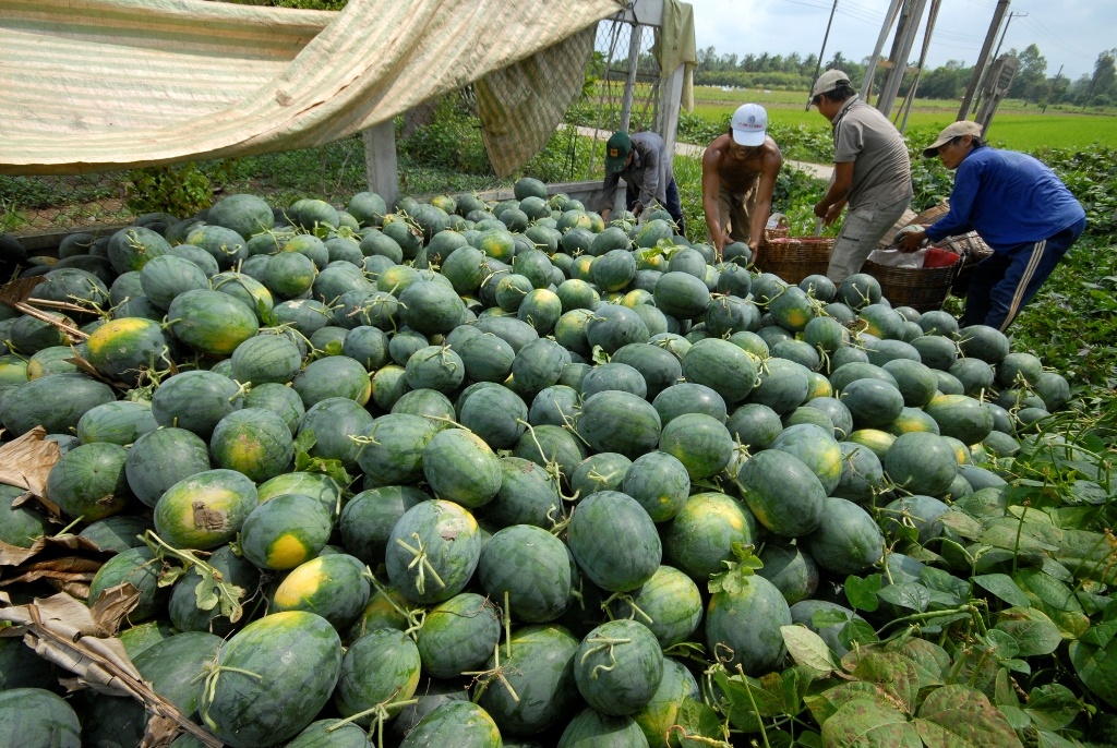| Dưa hấu xuống ghe để vận chuyển đến nơi tiêu thụ. |