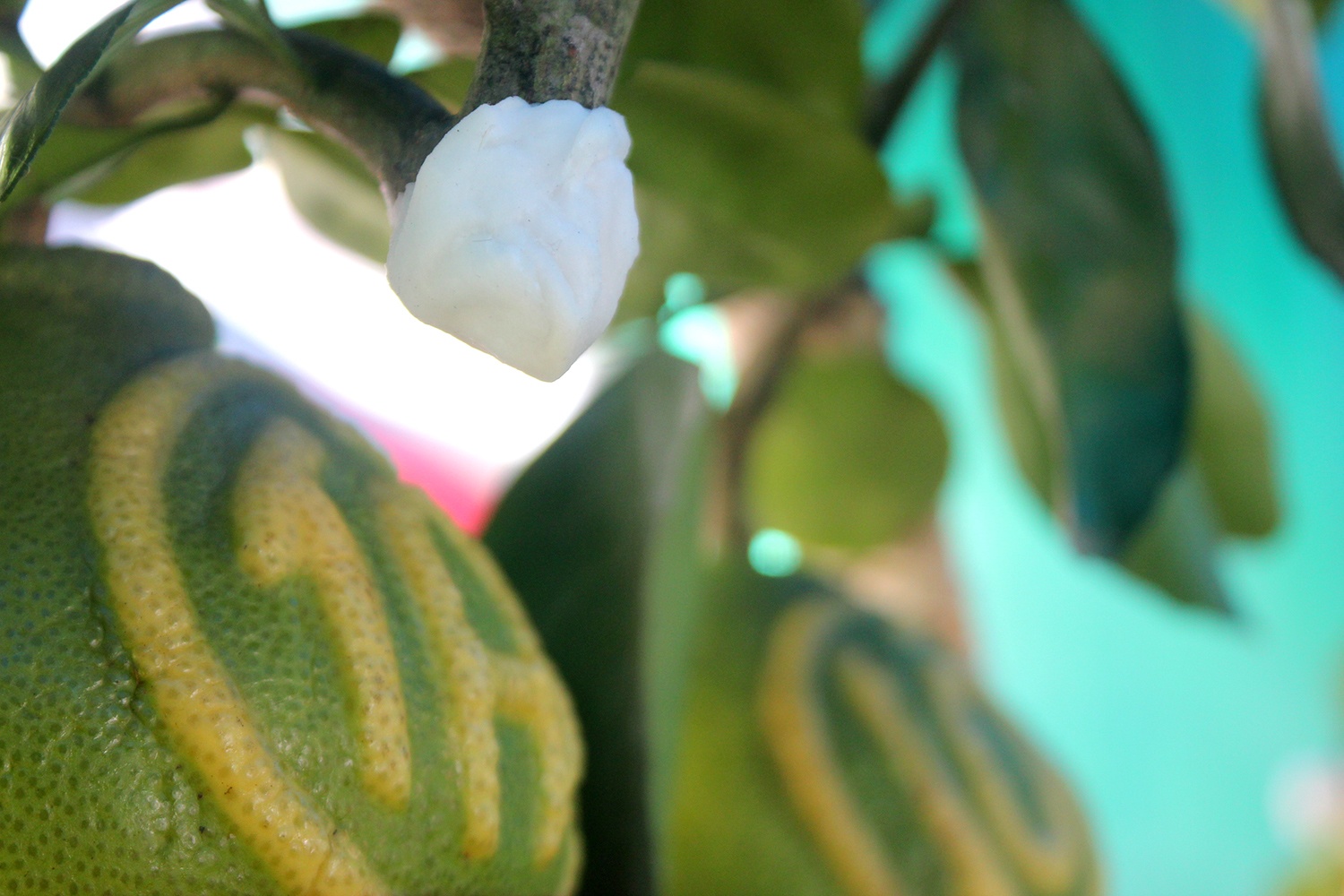 Các nhà vườn còn "thiết kế" thêm bông y tế thấm nước bao vào cuống bưởi để giữ cho lá luôn xanh tươi. |