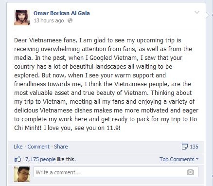Tuần này, Omar Borkan Al Gala sẽ có mặt tại TP.HCM để giao lưu với khán giả Việt Nam. Ngày hôm qua, trên trang cá nhân của mình, Omar đã đăng tải dòng chia sẻ cảm ơn người hâm mộ và giới truyền thông.