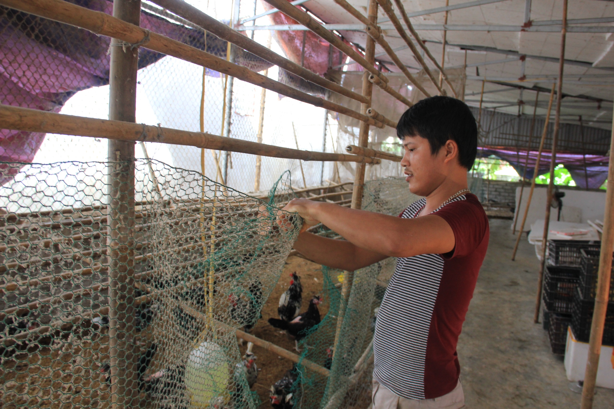 Giống gà mới, kinh nghiệm nuôi chưa nhiều nhiều nên lúc đầu anh Hợi cũng gặp nhiều khó khăn. "Tháng đầu dựng trại trời mưa to làm đàn gà con chết gần hết hơn 50 con, gà mẹ thì còm nhom không chịu đẻ trứng. Thấy cùng cực lắm, tôi định bỏ. Nhưng sau tĩnh tâm lại, tôi lên mạng Internet đọc thêm kiến thức và học hỏi cách làm chuồng trại, phương pháp chống dịch bệnh, sau thì thành công", anh kể.