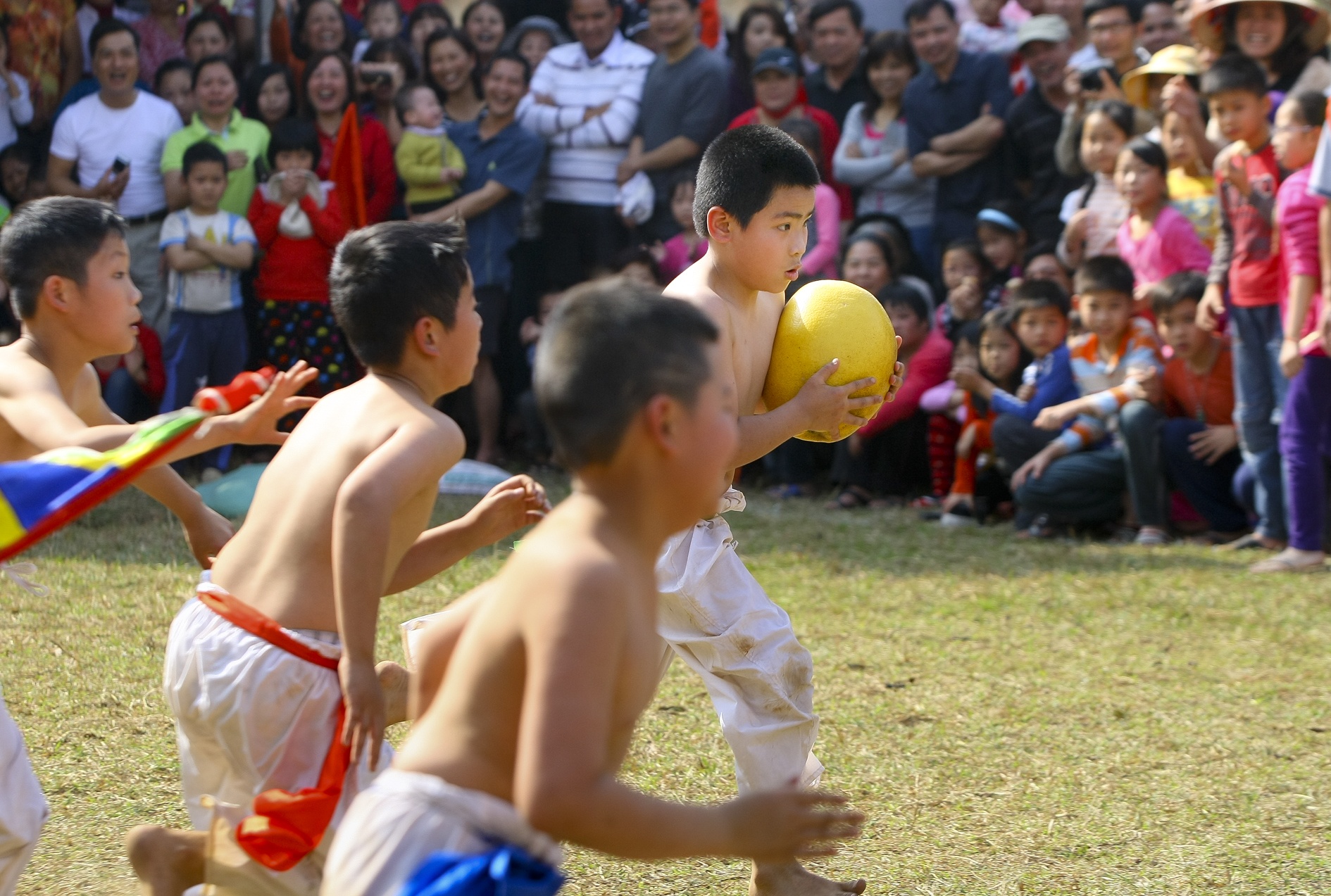 Trước khi màn đấu chính thức (tranh cầu) do các trai tráng tuổi trên 18 diễn ra là phần tranh tài của các em nhỏ tuổi từ 13 đến 16 cùng tranh cướp quả bòng nặng vài kg.