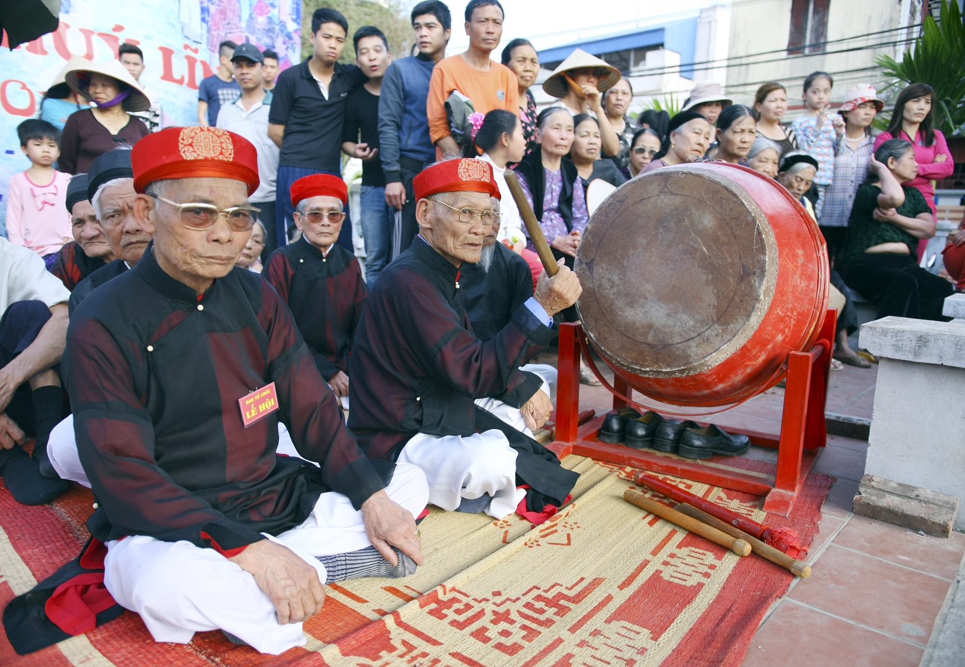 Bên trong, các cụ già liên tục đánh trống cổ vũ.