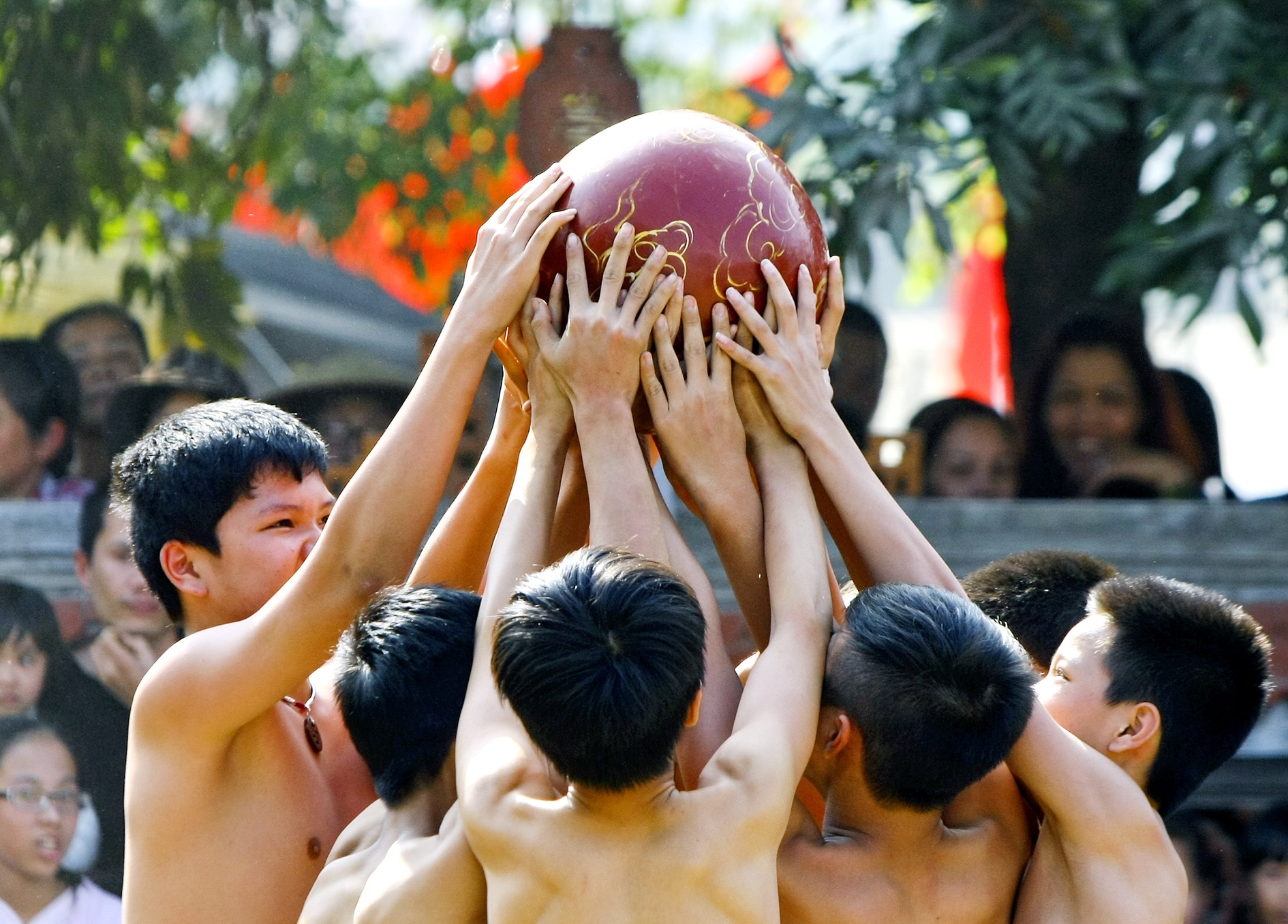 | Một quả cầu được sơn son nặng 20kg dành cho thanh niên trên 18 tuổi, 10kg dành cho tuổi từ 13 đến 16. |
