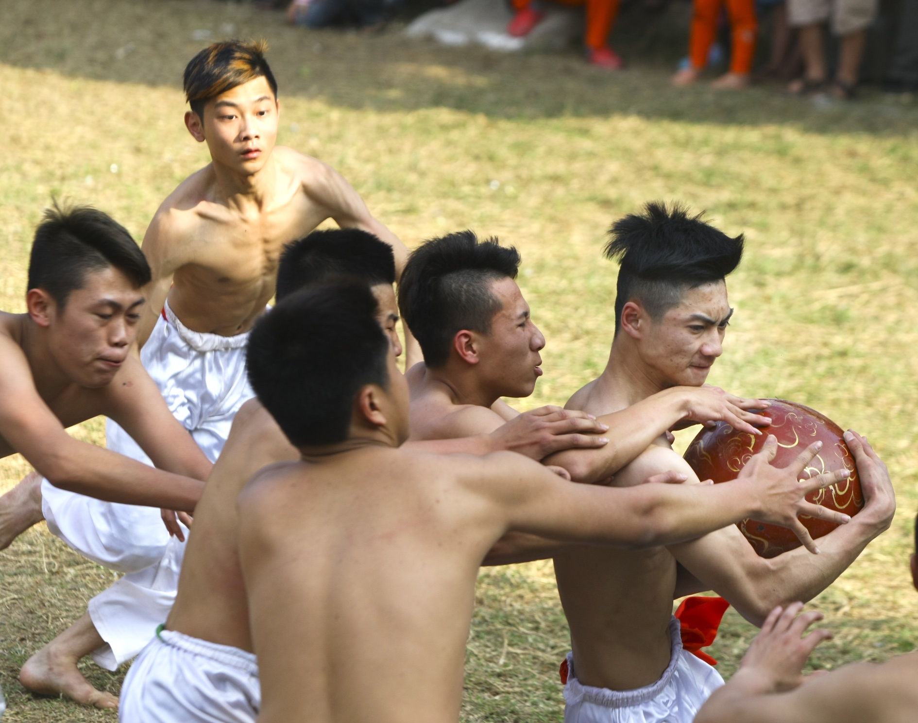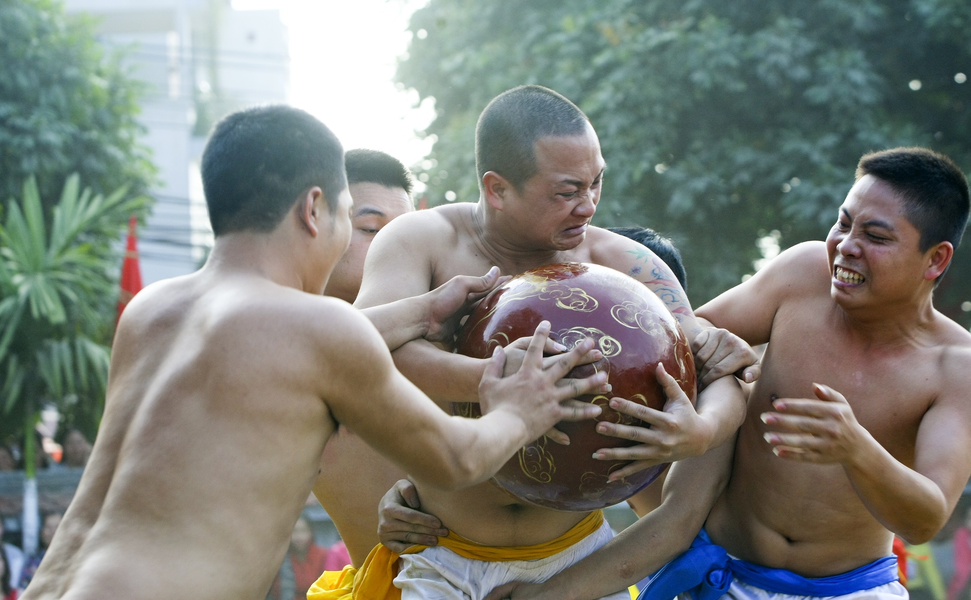 Về cơ bản phần thi đấu của lứa tuổi nào cũng như nhau. Các VĐV được chia làm 4 đội, họ phải sử dụng chiến thuật làm sao để tranh cướp được quả cầu bằng gỗ 20kg, đường kính hơn 40cm mang về hố của đội mình. Mỗi một lần như vậy được tính là một lần thắng.