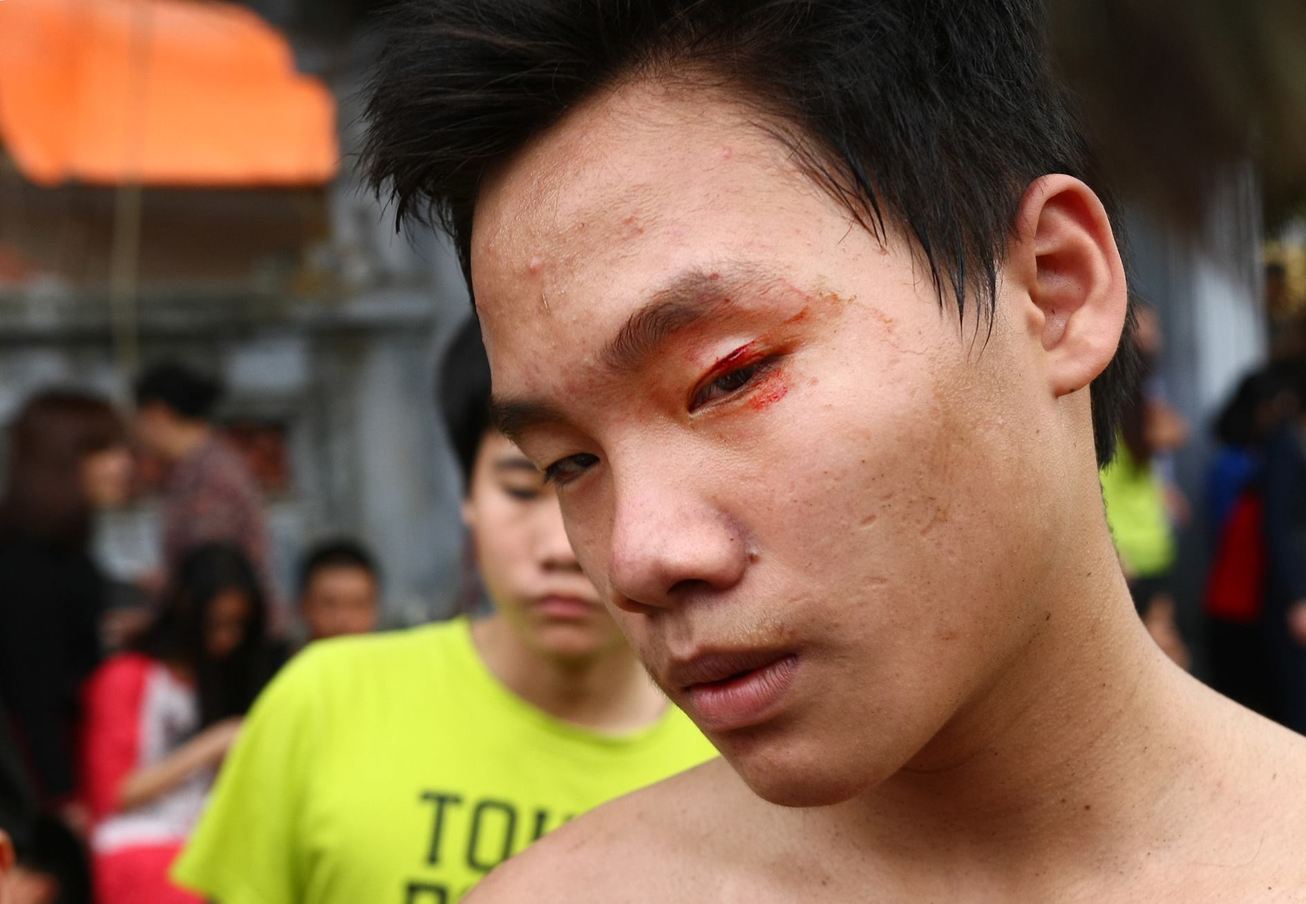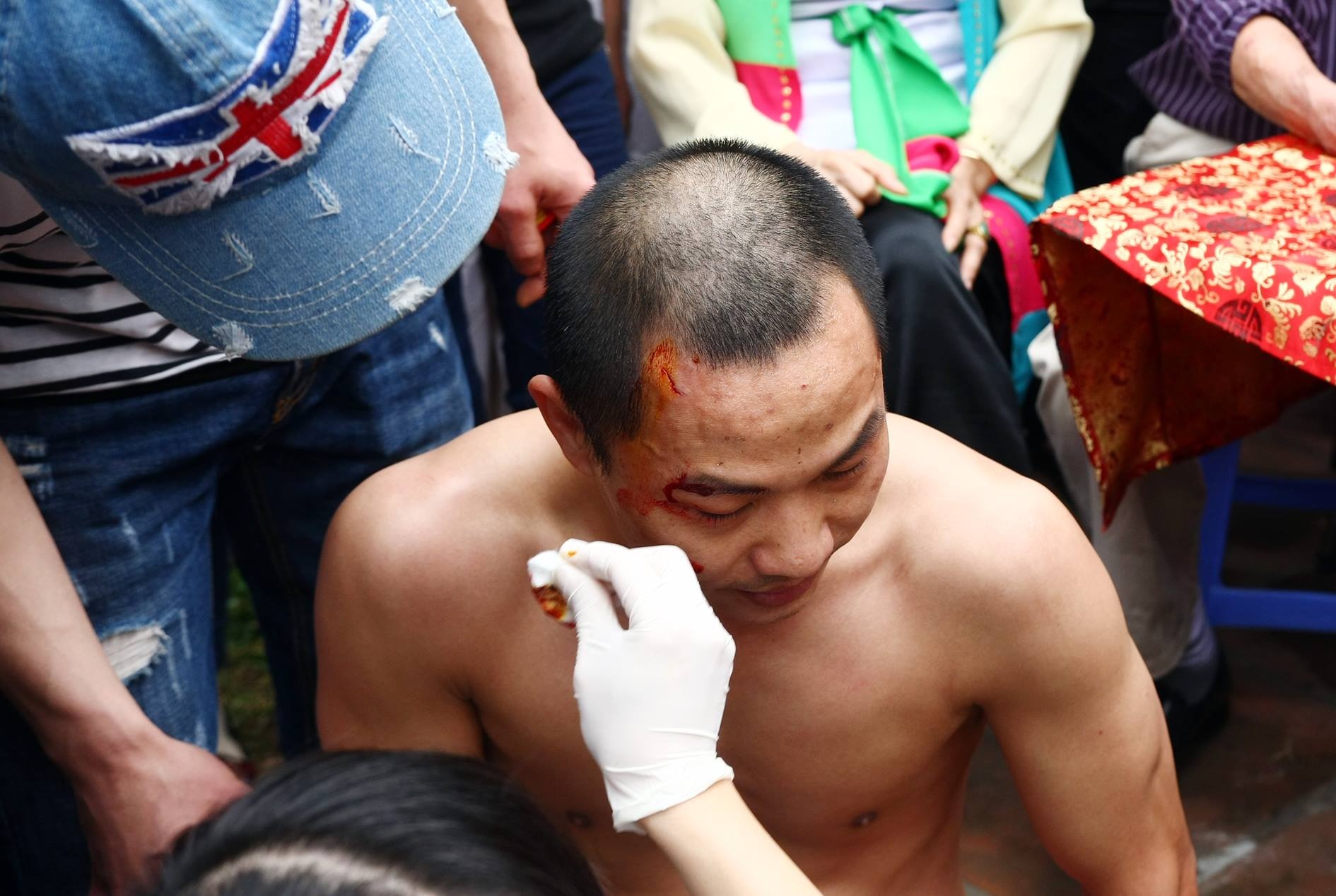 Cảnh đổ máu tại lễ hội vật cầu đầu xuân làng Thúy Lĩnh, quận Hoàng Mai (Hà Nội) chiều 22/2. Tổng cộng có ba thanh niên bị thương vào mắt và trán trong quá trình thi đấu. BTC đã phải cho tạm dừng để chữa trị.