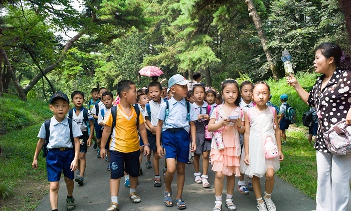 Daniel Miller, nhà sản xuất âm nhạc đến từ Anh đồng thời là người sáng lập công ty thu âm Mute Records - thương hiệu của ban nhạc Laibach - ghi lại một số hình ảnh về Bình Nhưỡng. Trong hình, Miller cùng nhóm học sinh tham quan đồi Mansudae. Ảnh: Daniel Miller
