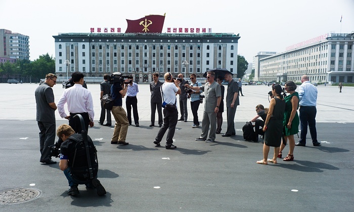 | Phóng viên chụp ảnh các thành viên ban nhạc tại quảng trường Kim Nhật Thành. Ảnh: Daniel Miller |