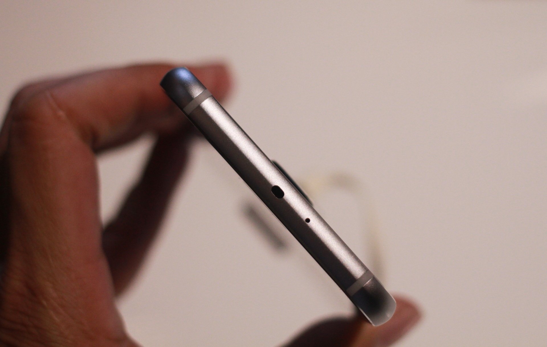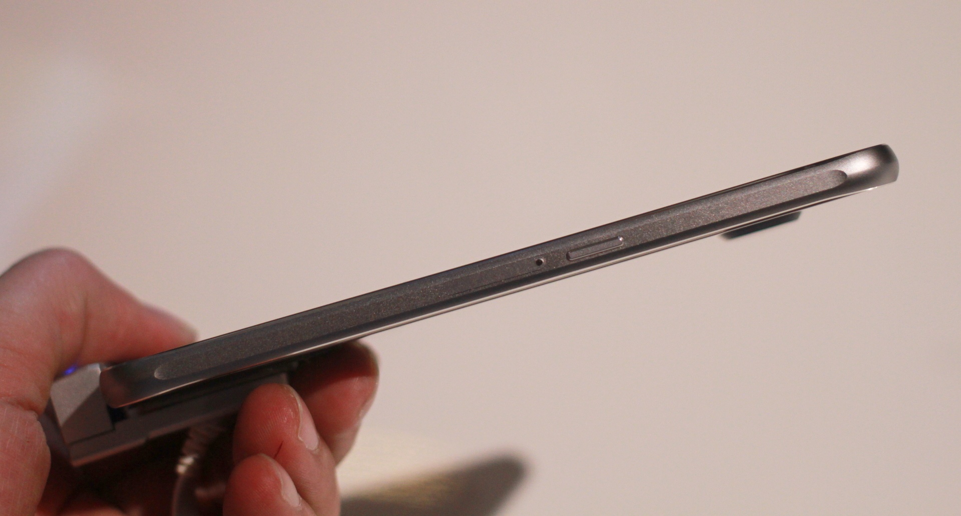 | So với Galaxy S6 Edge, máy mỏng hơn 0,2 mm. Nhìn từ bên phải, model này có nút nguồn, khay SIM. |