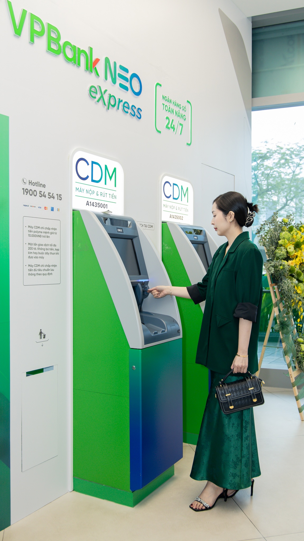 | Khu vực gần cửa chi nhánh flagship VPBank là hệ thống Self-service 24/7 được trang bị đầy đủ thiết bị công nghệ như ATM, CDM, SSM để khách hàng có thể tự thực hiện các giao dịch như chuyển, rút tiền, kiểm tra số dư, in sao kê tài khoản bất cứ thời điểm nào trong ngày. |