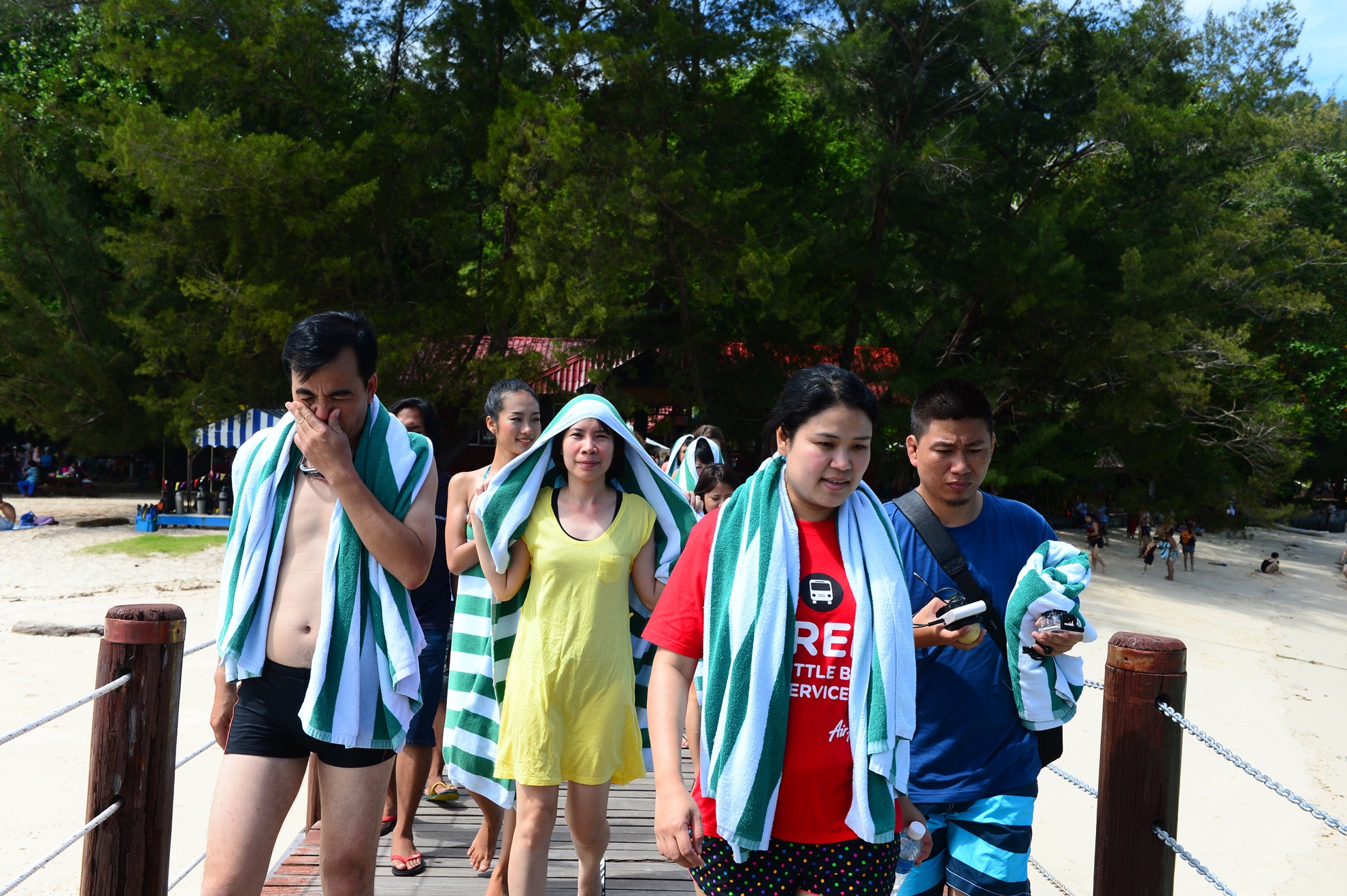 Một nhóm khách du lịch với 7 người đang đi ngang theo sợi dây thừng. Đàn cá cảnh biển sẽ quấn lấy du khách, thậm chí cắn vào chân bạn liên tục.