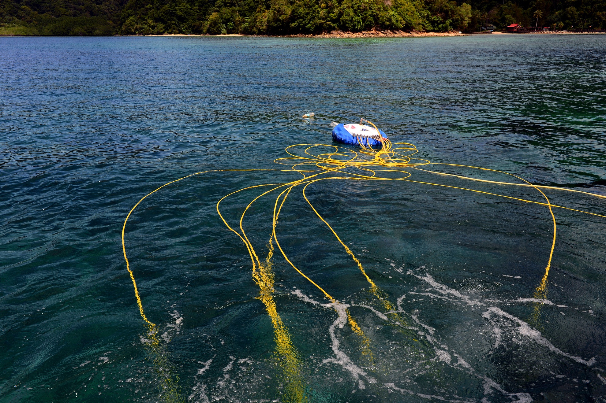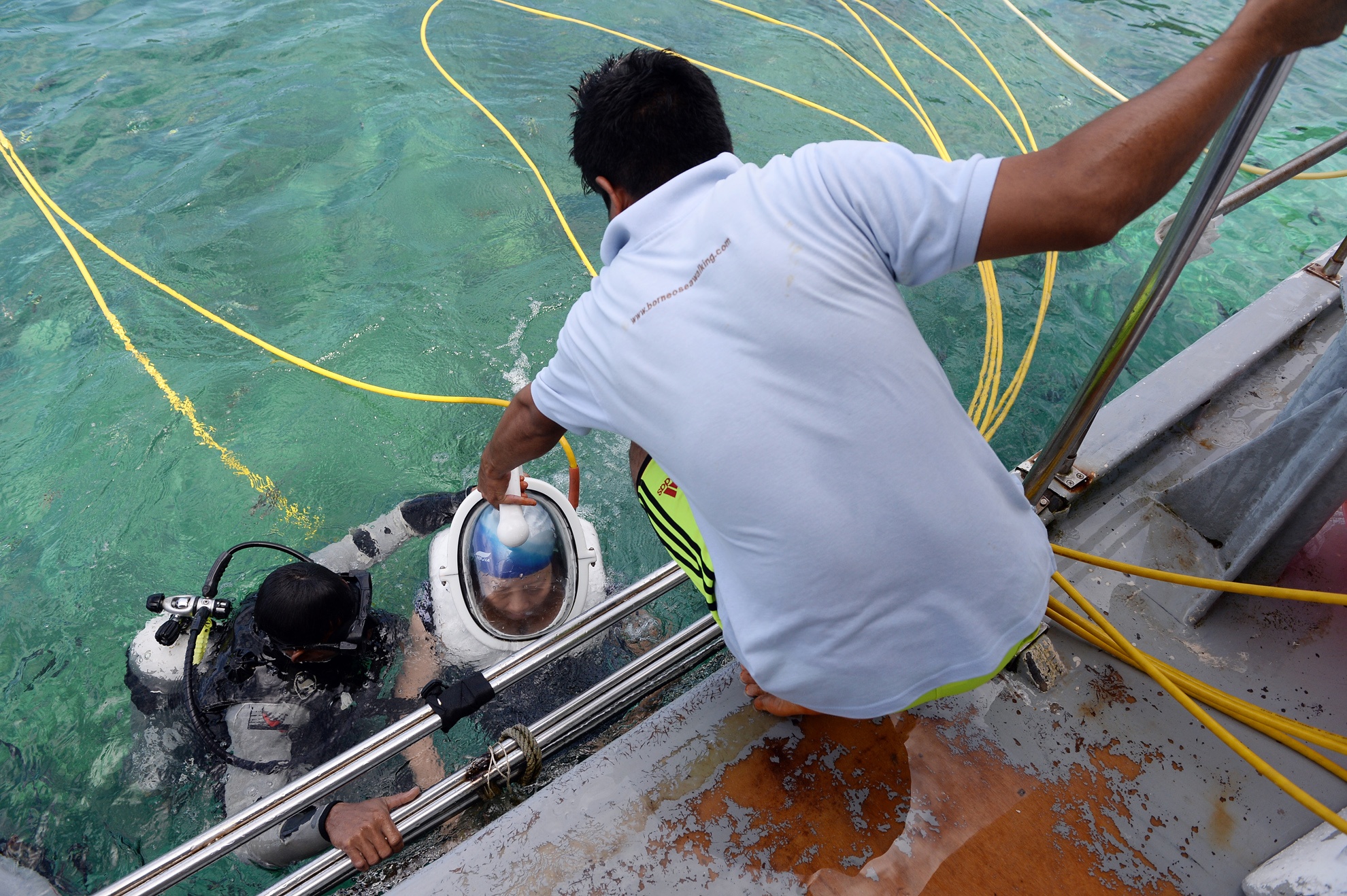 Hệ thống thở oxy, mỗi sợi dây được nối vào mỗi chiếc mũ bảo hiểm không khí. Du khách có thể ở dưới biển khoảng 30 phút tối đa cho một lần chơi.