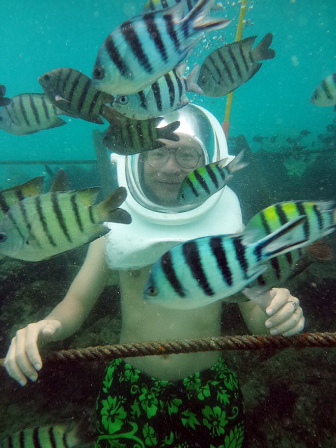 Sau khi đội chiếc mũ chụp nặng 35kg vào đầu, du khách sẽ từ từ bước xuống đáy biển ở độ sâu 5 mét qua một chiếc thang tàu du lịch rồi bám vào dây thừng buộc ngang bên dưới và thoải mái đùa nghịch với đàn cá cảnh.
