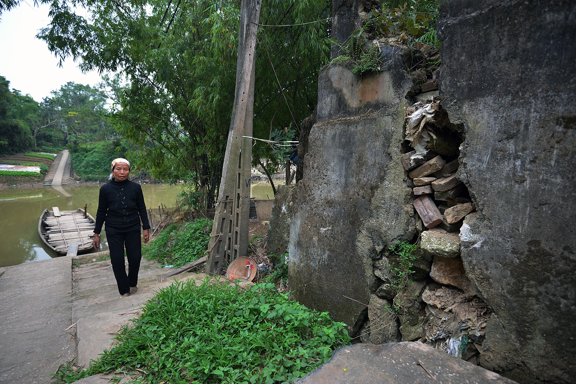| Ông Đỗ Viết Thắng, Trưởng thôn 5 (xã Quảng Bị, Chương Mỹ) cho biết, đội 8 có hơn 100 hộ năm nào cũng bị nước ngập vào nhà. Hầu như nhà nào cũng bị rạn nứt, trận lụt năm 2008, hàng trăm người phải di dời khẩn cấp về đội 13, xã Trần Phú ở tạm trong nhà dân và các công trình công cộng. Tại đội 9 tình trạng sạt lở diễn ra rất nghiêm trọng. Nhiều công trình phụ, chuồng trại, nhà vệ sinh của dân đã trôi xuống sông. |