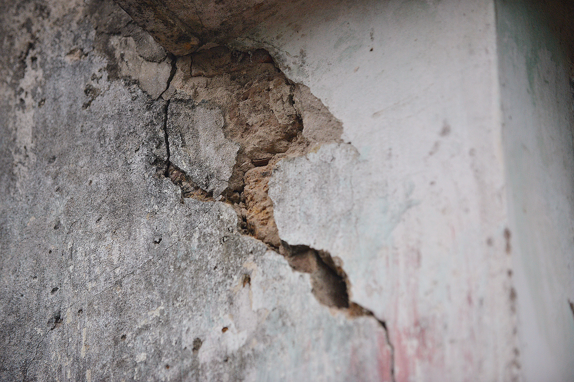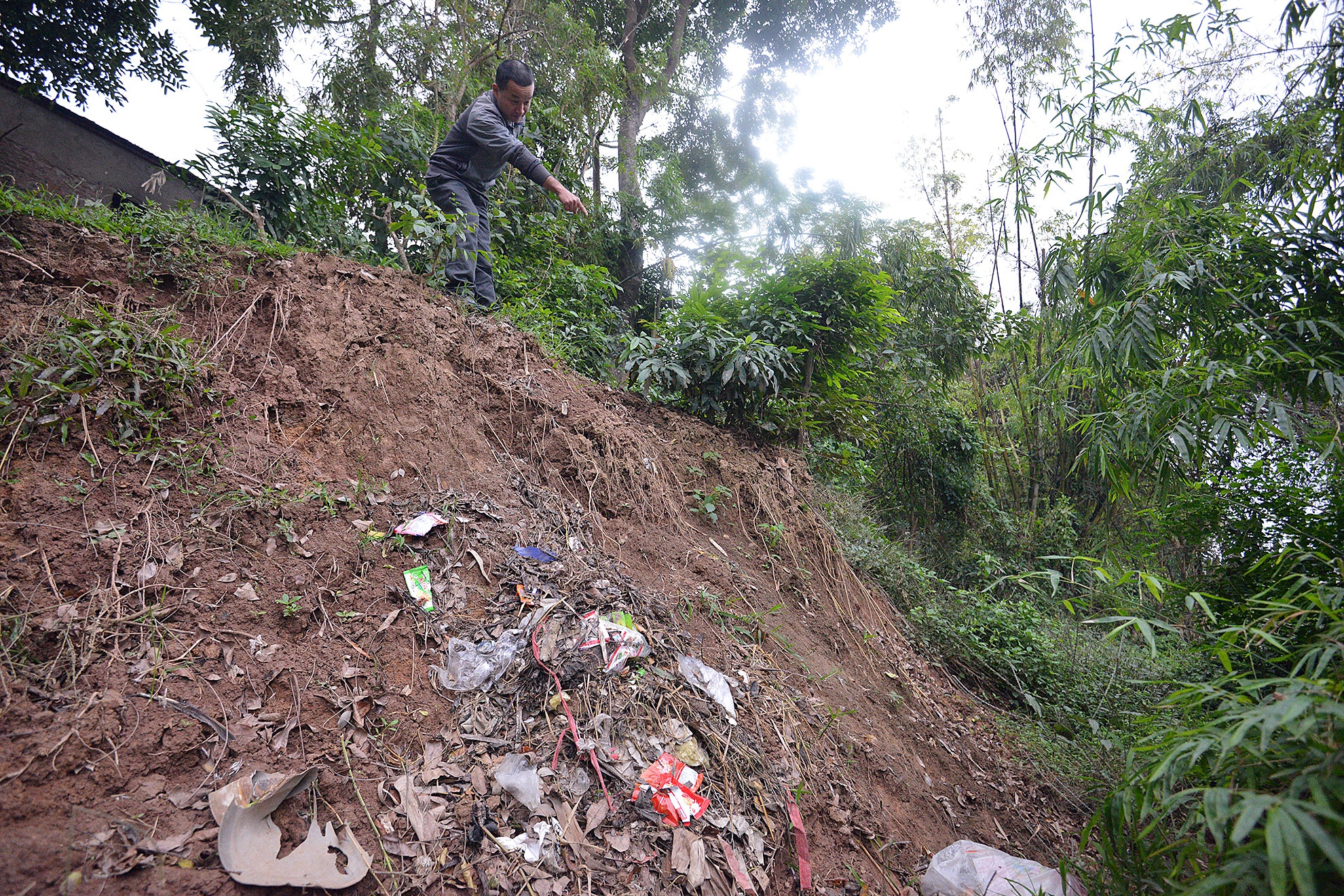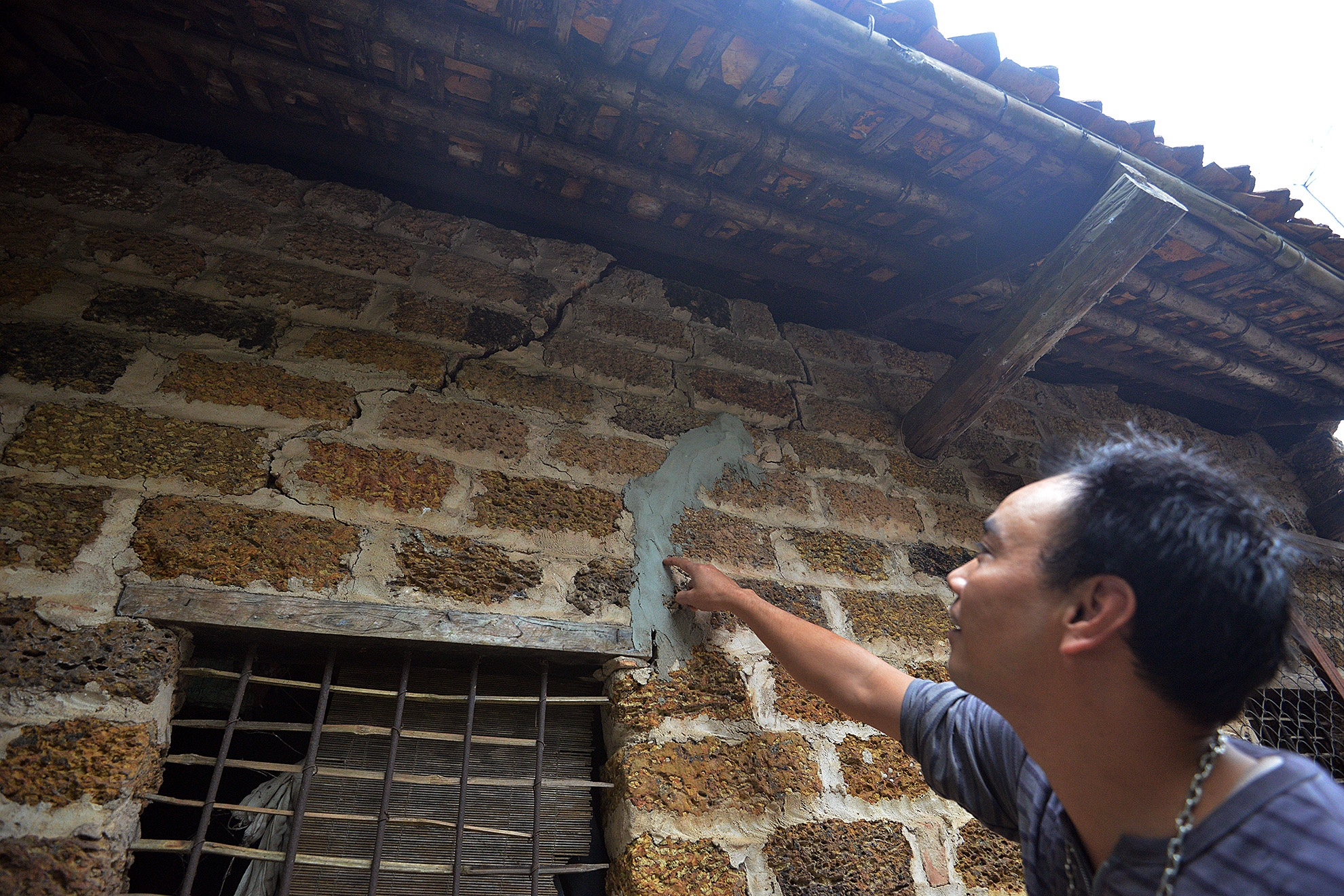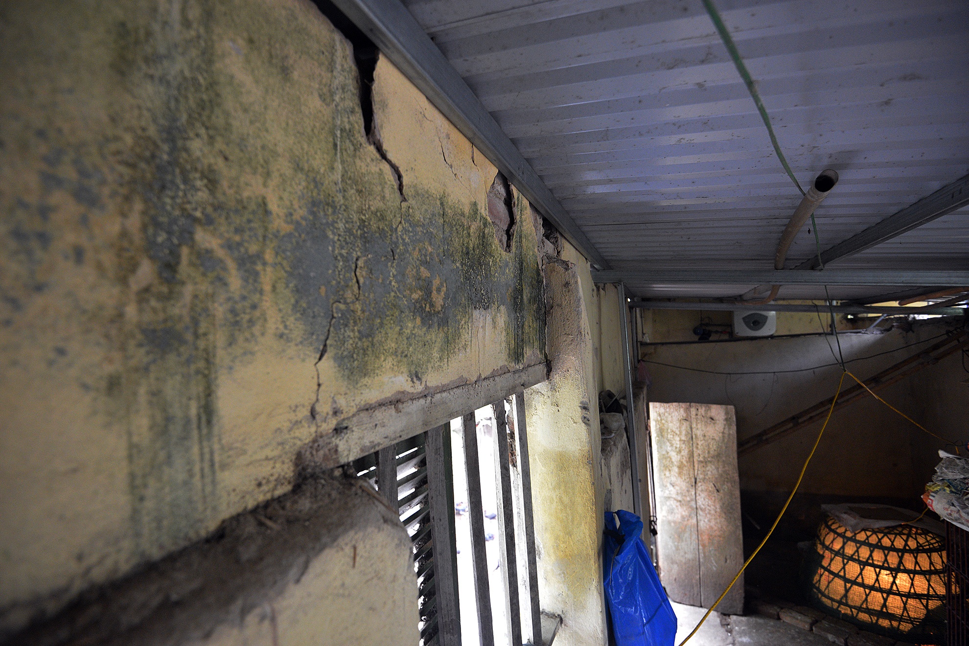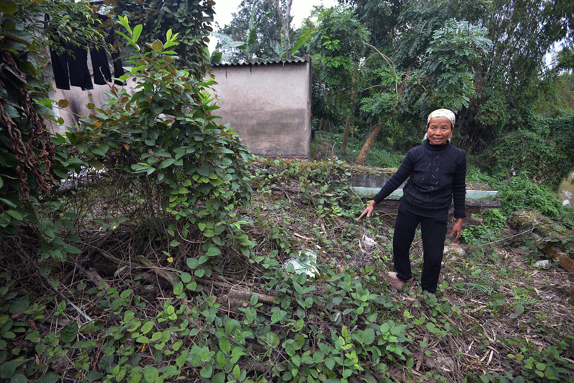 Gia đình anh Nguyễn Viết Dục (38 tuổi) ở đội 8 (thôn 5, xã Quảng Bị) cũng đang bị ảnh hưởng nặng bởi tình trạng sạt lở. Phần đất anh Dục nằm sát với bờ tả sông Bùi nên nhiều chỗ bị “hà bá”cuốn trôi. Nhà ở và những công trình phụ nhà anh như bếp, sân, nhà tắm, chuồng gà… đang bị nứt ở nhiều nơi. Anh chỉ có thể sửa bằng cách đắp xi măng lên tường.