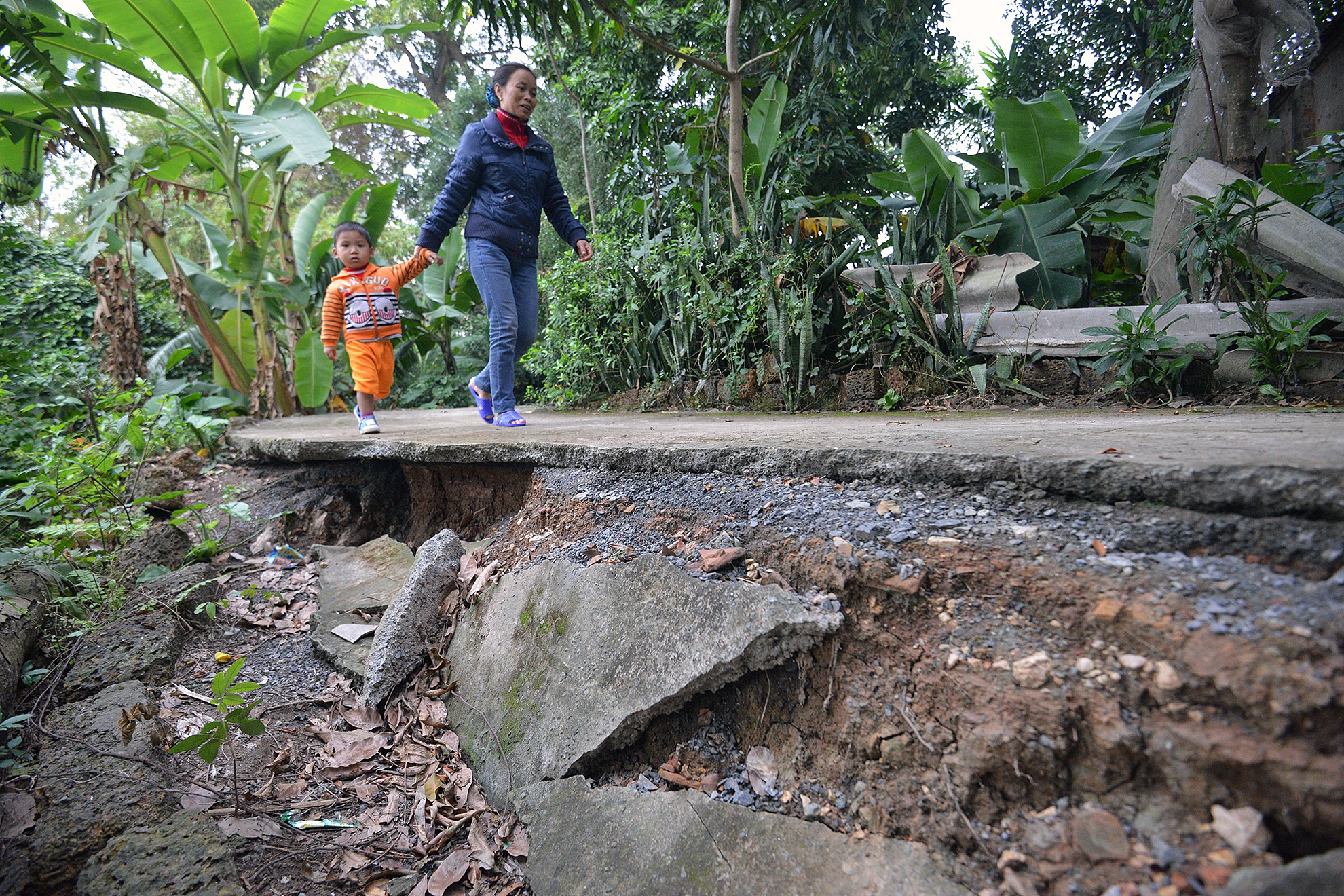 | Con đường láng bê tông dẫn vào nhà anh Dục nhiều chỗ bị sụt thành những hầm sâu và rộng do phần đất bên dưới đường đã bị sạt xuống sông. Những cây xà cừ trồng ở ven đường cũng bị đổ nghiêng và xê dịch hẳn gốc về phía bờ sông chừng hơn 3 mét. “Ngày trước, từ con đường ra đến mép sông rộng hơn 10 mét nhưng giờ chỉ còn lại hơn 2 mét", anh Dục nói. |