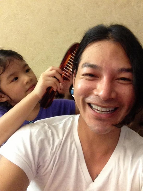 | Bức ảnh ngộ nghĩnh được Trần Bảo Sơn "khoe" trên trang cá nhân, với dòng chú thích: "Con gái yêu bắt mình giả gái". |