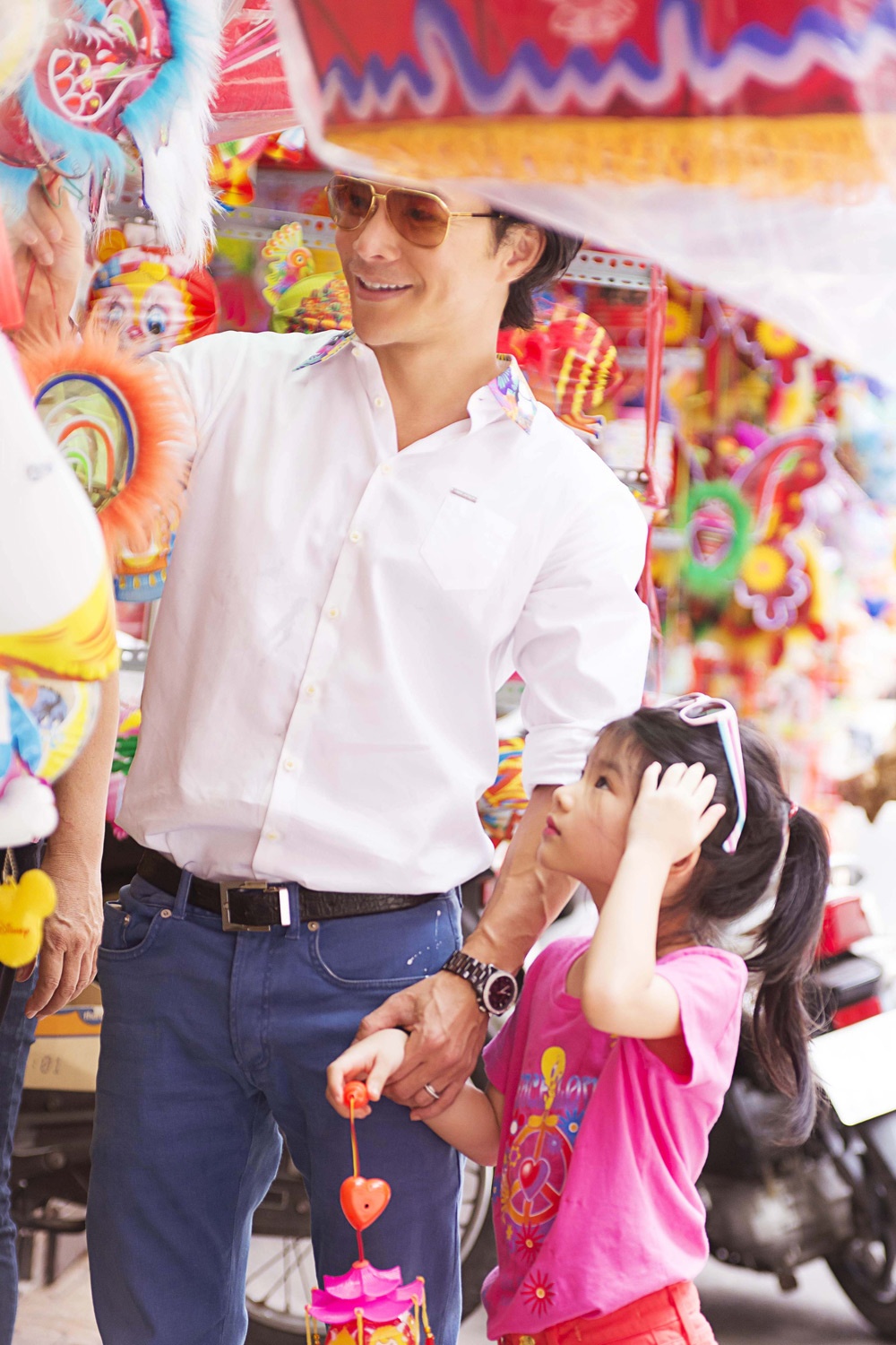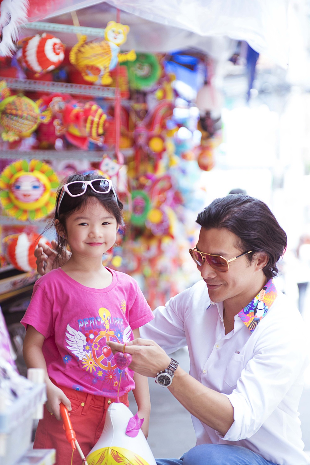 Vừa trở về sau gần một tháng quay phim “Đập cánh giữa không trung” ở Hà Nội và Tam Đảo, nam diễn viên “bù đắp” cho cô con gái Bảo Tiên một buổi đi mua sắm đồ Trung thu.