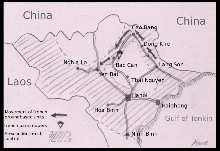| Bản đồ chiến dịch Việt Bắc năm 1947, Pháp muốn dùng sự áp đảo về sức mạnh quân sự để tiến hành một cuộc chiến tranh chớp nhoáng hòng tiêu diệt đầu não kháng chiến của ta. |