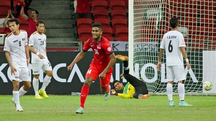 | Trận đấu thu hút được sự chú ý khi HLV Radojko Avramovic (Myanmar) gặp lại Singapore, đội bóng mà ông dẫn dắt 3 lần vô địch AFF Cup. Singapore chơi áp đảo khi dẫn đến 3-0 sau hiệp 1. Nhưng bước sang hiệp 2, Myanmar vùng lên mạnh mẽ và có liên tiếp 2 bàn gỡ khiến CĐV Singapore lo lắng. Phải đến khi Khin Maung Lwin của Myanmar đá phản lưới nhà ở phút 75, Singapore mới thở phào nhẹ nhõm với chiến thắng 4-2. Ảnh: ESPN. |