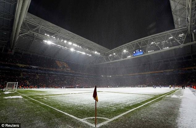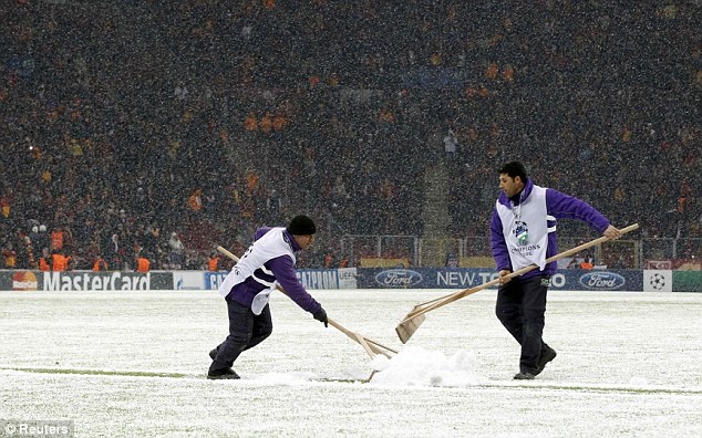 | Mặt sân Turk Telekom Arena (Thổ Nhĩ Kỳ) bị phủ một lớp tuyết khá dầy. |