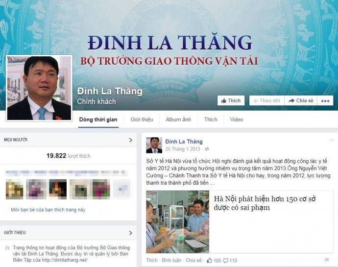 | Trang fanpage giả mạo Bộ trưởng Bộ Giao thông vận tải Đinh La Thăng. |