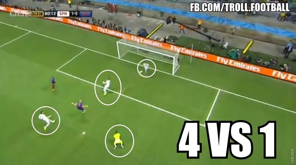 | Cả 4 cầu thủ của Tây Ban Nha cũng không thể ngăn Robben ghi bàn |