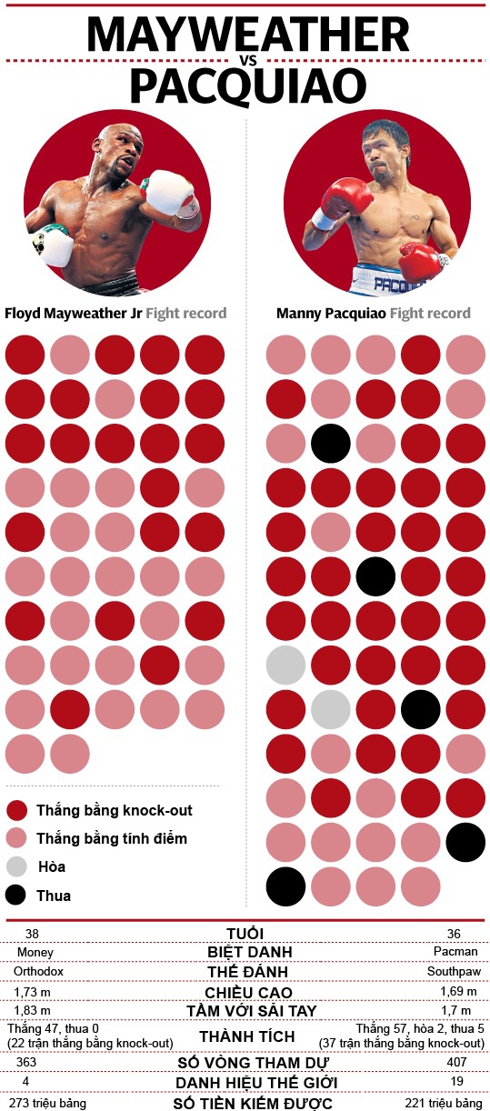 Cuộc so tài giữa Floyd Mayweather và Manny Pacquiao diễn ra lúc 18h ngày 2/5 (tức 9h ngày 3/5 giờ Việt Nam) tại đấu trường MGM Grand, Las Vegas. Ban tổ chức mở cửa đón khán giả lúc 14h. Lễ khai mạc diễn ra lúc 15h và bế mạc lúc 20h. Zing.vn sẽ tường thuật trực tiếp trận đấu lịch sử này.